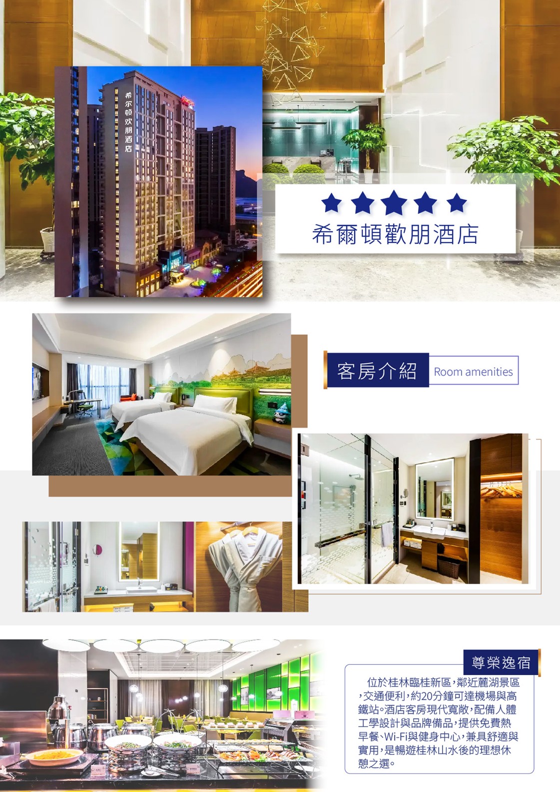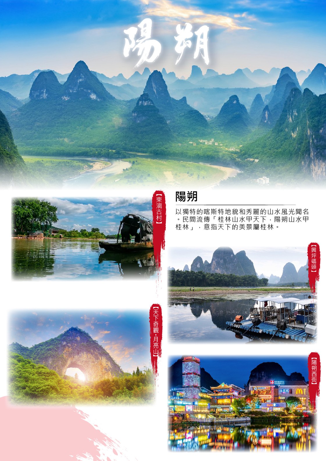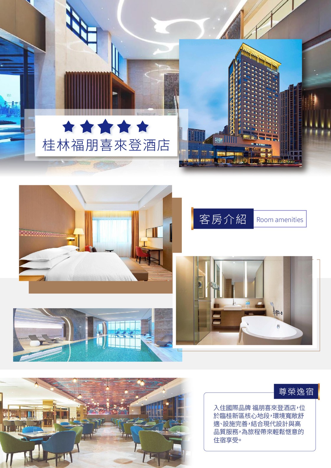 貴賓從桃園機場出發,搭乘客機經香港飛往【桂林】。桂林-是廣西壯族自治區地級市,是世界著名的旅遊城市、中國首批國家歷史文化名城、中國優秀旅遊城市,其境內的山水風光舉世聞名,千百年來享有"桂林山水甲天下"的美譽。桂林地處廣西壯族自治區東北部,是廣西最大空港,桂東北地區的政治、經濟、文化、交通中心,桂林北接湖南、貴州,西面、南面與柳州市相連,東面與賀州市毗鄰,屬山地丘陵地區,為典型的"喀斯特"岩溶地貌,遍佈全市的石灰岩經億萬年的風化浸蝕,形成了千峰環立,一水抱城,洞奇石美的獨特景觀。桂林屬亞熱帶氣候,氣候溫和,雨量充沛,年平均降雨量為1900毫米,全年無霜期300天左右,年平均日照1550小時以上,平均溫度19°C,冬無嚴寒,夏無酷暑。