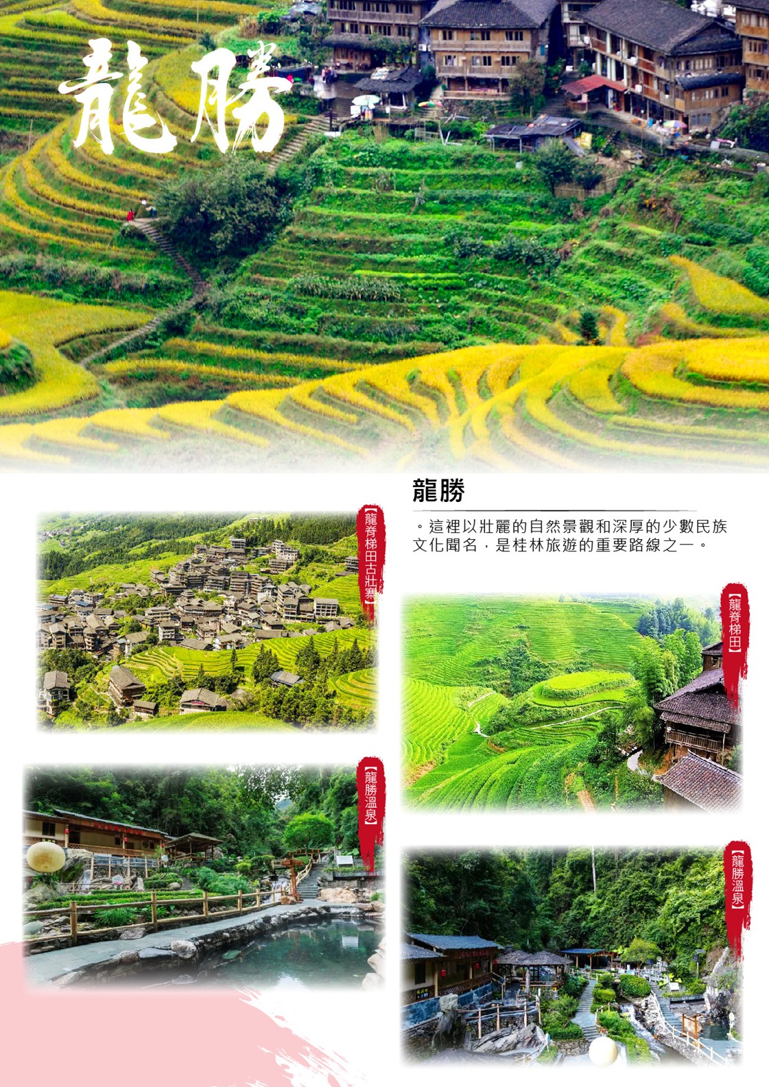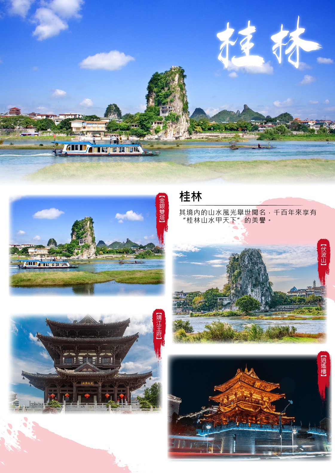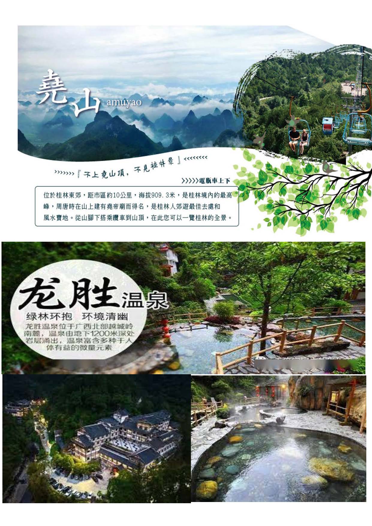 貴賓從桃園機場出發,搭乘客機經香港飛往【桂林】。桂林-是廣西壯族自治區地級市,是世界著名的旅遊城市、中國首批國家歷史文化名城、中國優秀旅遊城市,其境內的山水風光舉世聞名,千百年來享有"桂林山水甲天下"的美譽。桂林地處廣西壯族自治區東北部,是廣西最大空港,桂東北地區的政治、經濟、文化、交通中心,桂林北接湖南、貴州,西面、南面與柳州市相連,東面與賀州市毗鄰,屬山地丘陵地區,為典型的"喀斯特"岩溶地貌,遍佈全市的石灰岩經億萬年的風化浸蝕,形成了千峰環立,一水抱城,洞奇石美的獨特景觀。桂林屬亞熱帶氣候,氣候溫和,雨量充沛,年平均降雨量為1900毫米,全年無霜期300天左右,年平均日照1550小時以上,平均溫度19°C,冬無嚴寒,夏無酷暑。