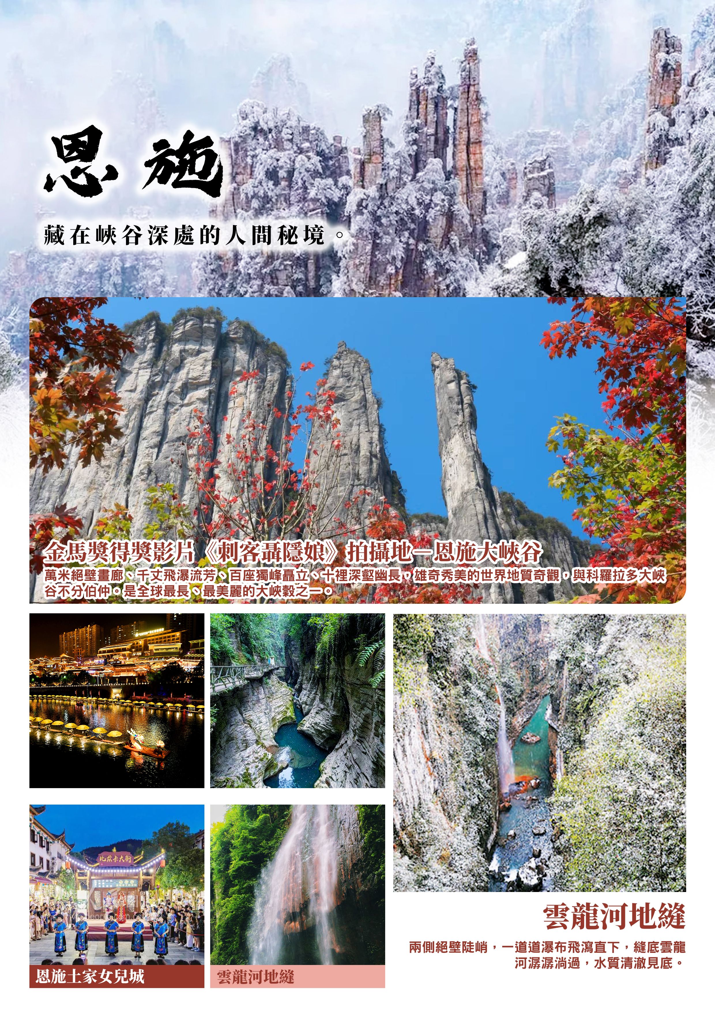 去程:9C8523 上海浦東 07:20-恩施機場 09:55【恩施大峽谷】金馬獎得獎影片《刺客聶隱娘》拍攝地國家5A級旅遊景區,萬米絕壁畫廊、千丈飛瀑流芳、百座獨峰矗立、十裡深壑幽長,雄奇秀美的世界地質奇觀,與科羅拉多大峽谷不分伯仲。其不偏不倚落腳於神秘的北緯30度,是全球最長、最美麗的大峽穀之一。◆雲龍河地縫:(含單程地面纜車+景區用車+小蠻腰電梯返程)為世界之最。僅暗河之上的豎井就有108個...