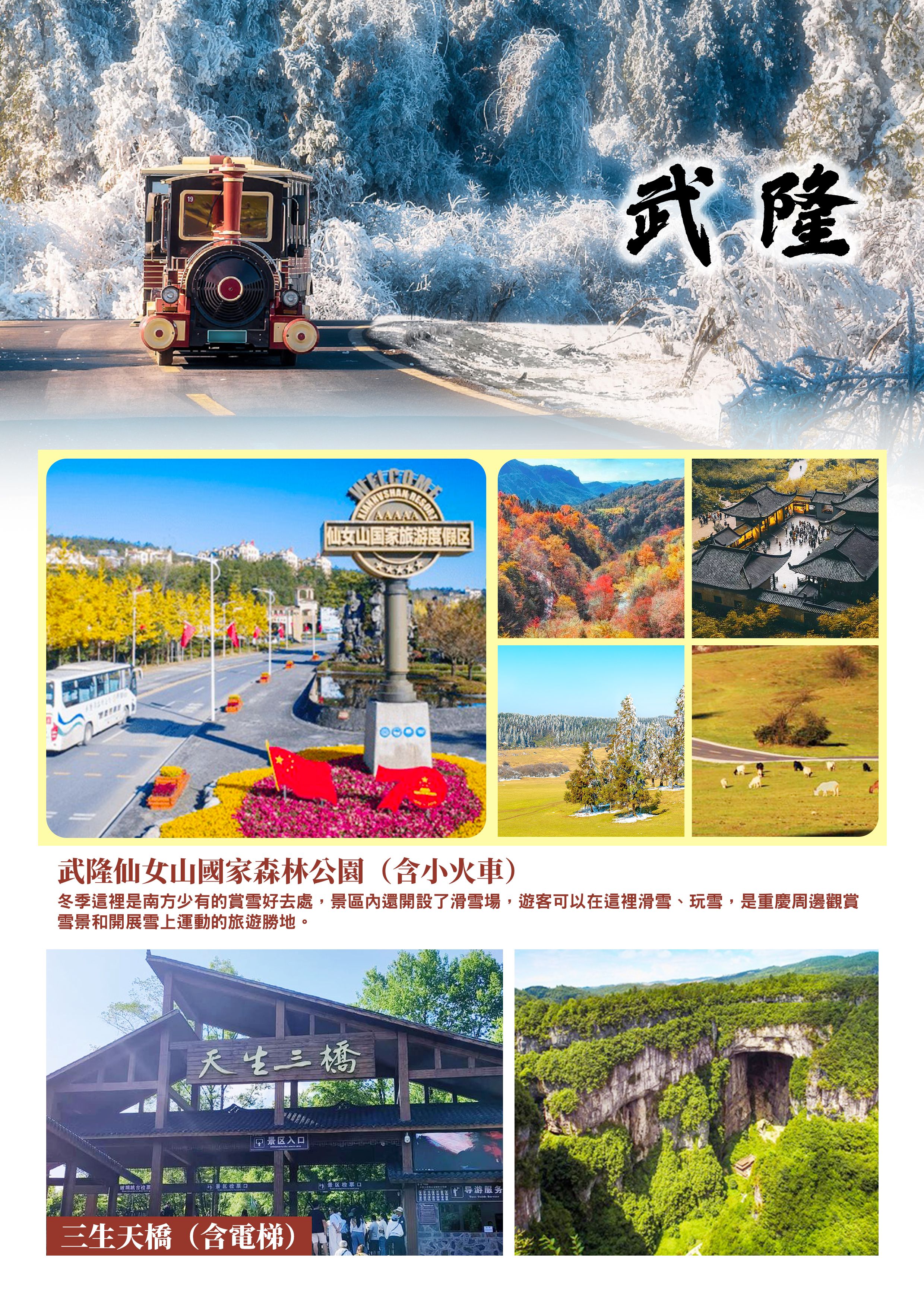 【武隆仙女山國家森林公園(含小火車)】位於重慶武隆縣雙河鄉,距縣城35公里。與武隆縣境內眾多的喀斯特地貌相比,這裡以南方少有的高山草原風光而聞名。夏季和冬季,是遊覽仙女山的最好季節。冬季這裡是南方少有的賞雪好去處,景區內還開設了滑雪場,遊客可以在這裡滑雪、玩雪,是重慶周邊觀賞雪景和開展雪上運動的旅遊勝地。景區內有餐飲服務,部分遊客會在景區內住宿一晚,景區內有不少農家樂和星級酒店可供選擇。此外,仙女...