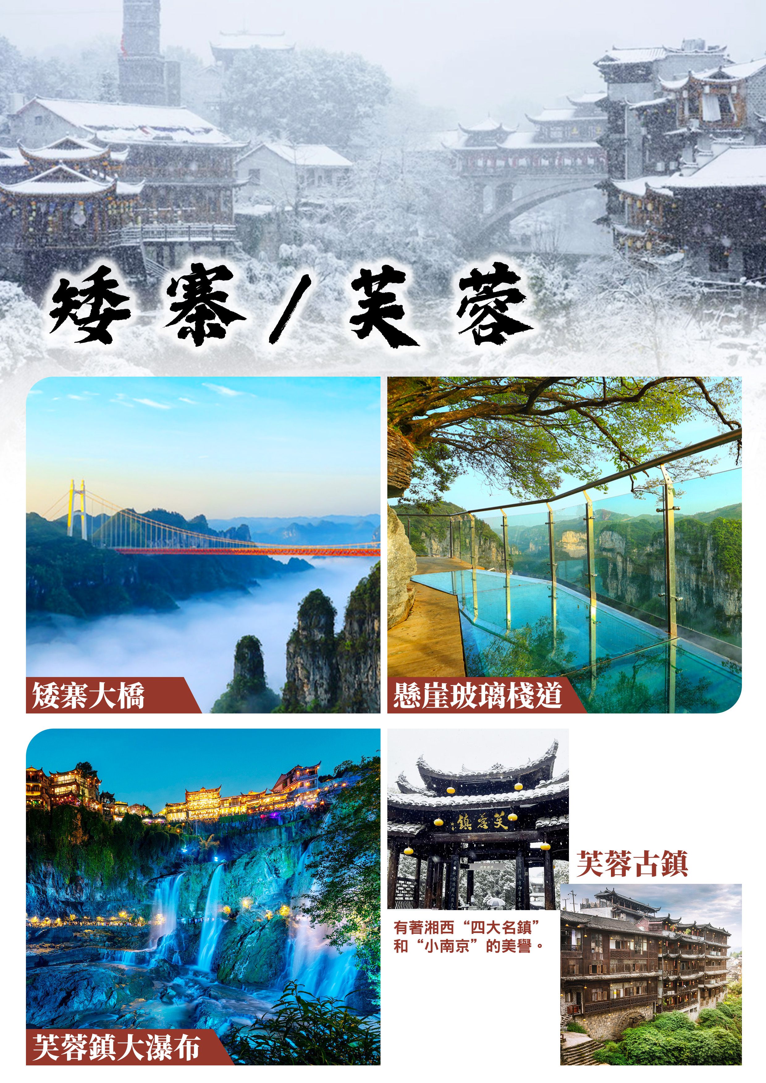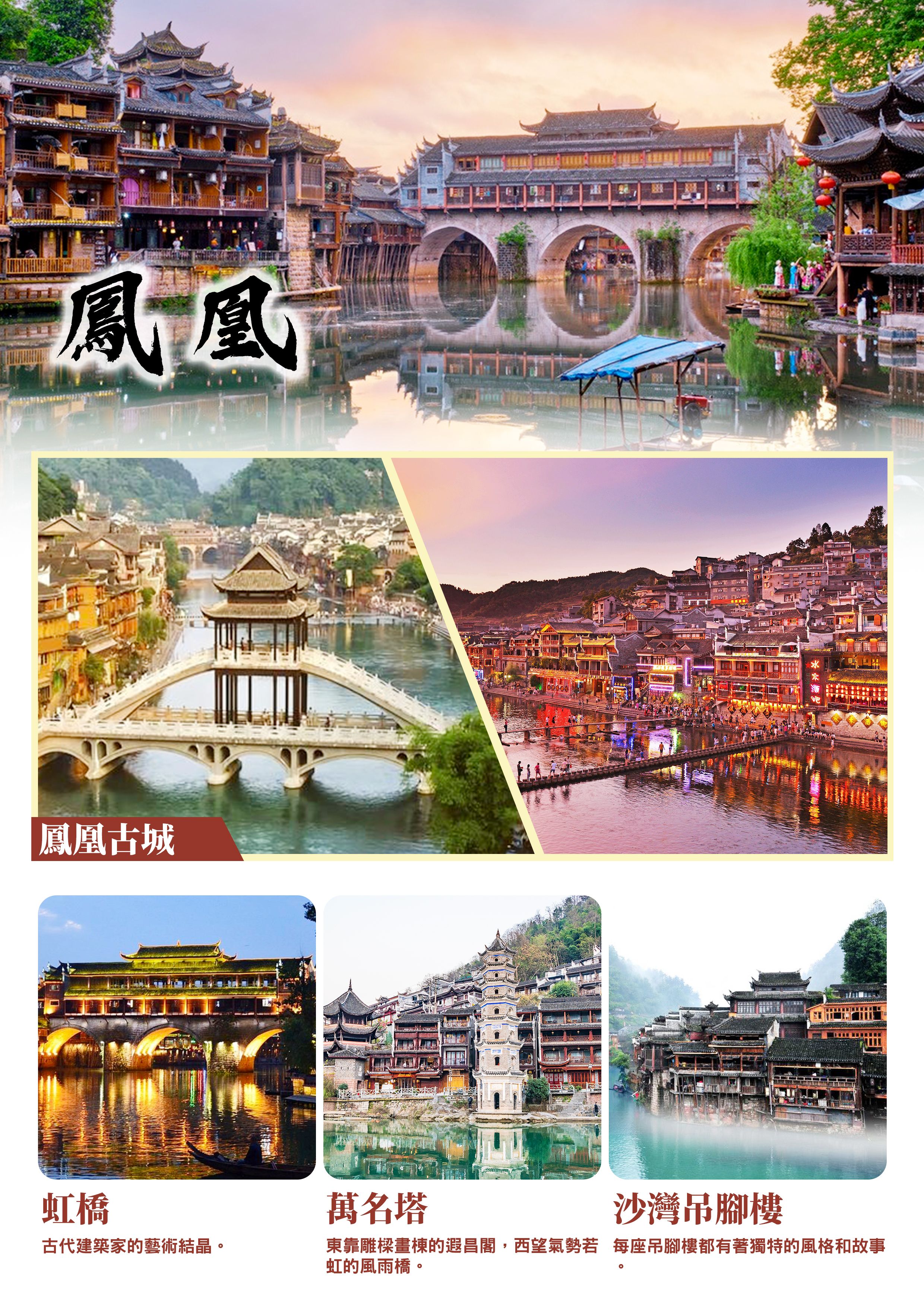 【三生天橋(含電梯)】位於重慶武隆區仙女山鎮,是重慶直轄市級風景名勝區,重慶武隆岩溶國家地質公園的一部分,也被評為中國國家5A級旅遊景區。【鳳凰古城】中國歷史文化名城,曾被新西蘭著名作家路易·艾黎稱讚為中國美麗的小城,與雲南麗江古城、山西平遙古城媲美,享有“北平遙,南鳳凰”之美譽,古城建於清康熙時,因沈從文的小說《邊城》而聞名於世。城內的青石板街道、沱江邊的吊腳樓、眾多的古建築,以及濃厚的苗族風情...