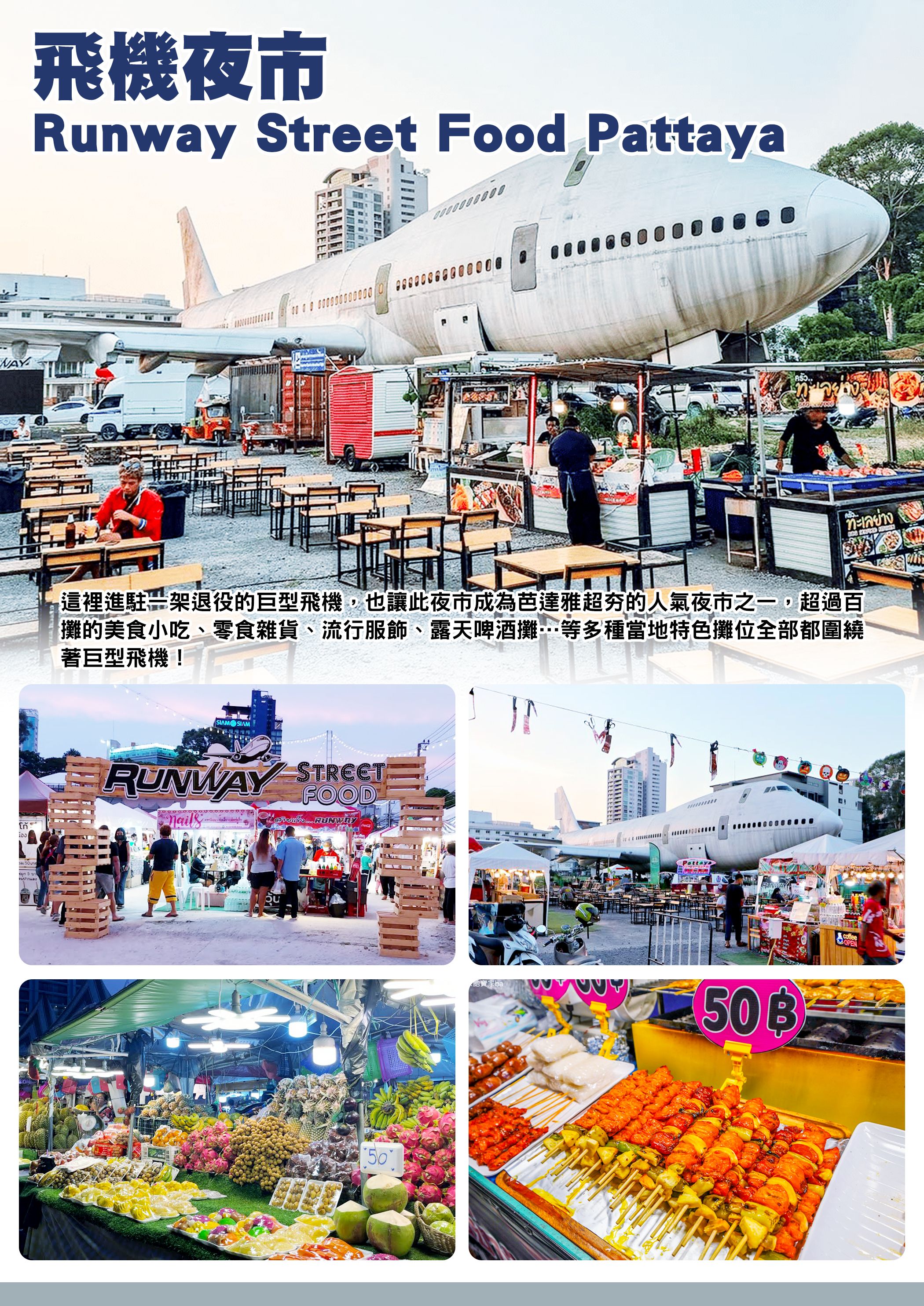 【飛機夜市Runway Street Food Pattaya】來泰國芭達雅逛夜市,絕對不能錯過飛機夜市Runway Street Food Pattaya ,這裡進駐一架退役的巨型飛機,也讓此夜市成為芭達雅超夯的人氣夜市之一,超過百攤的美食小吃、零食雜貨、流行服飾、露天啤酒攤…等多種當地特色攤位全部都圍繞著巨型飛機,且此架飛機周邊也設置不少露天座位,可以買一些當地小吃配啤酒,坐在飛機底下的座位區用餐,氛圍真的很不一樣。