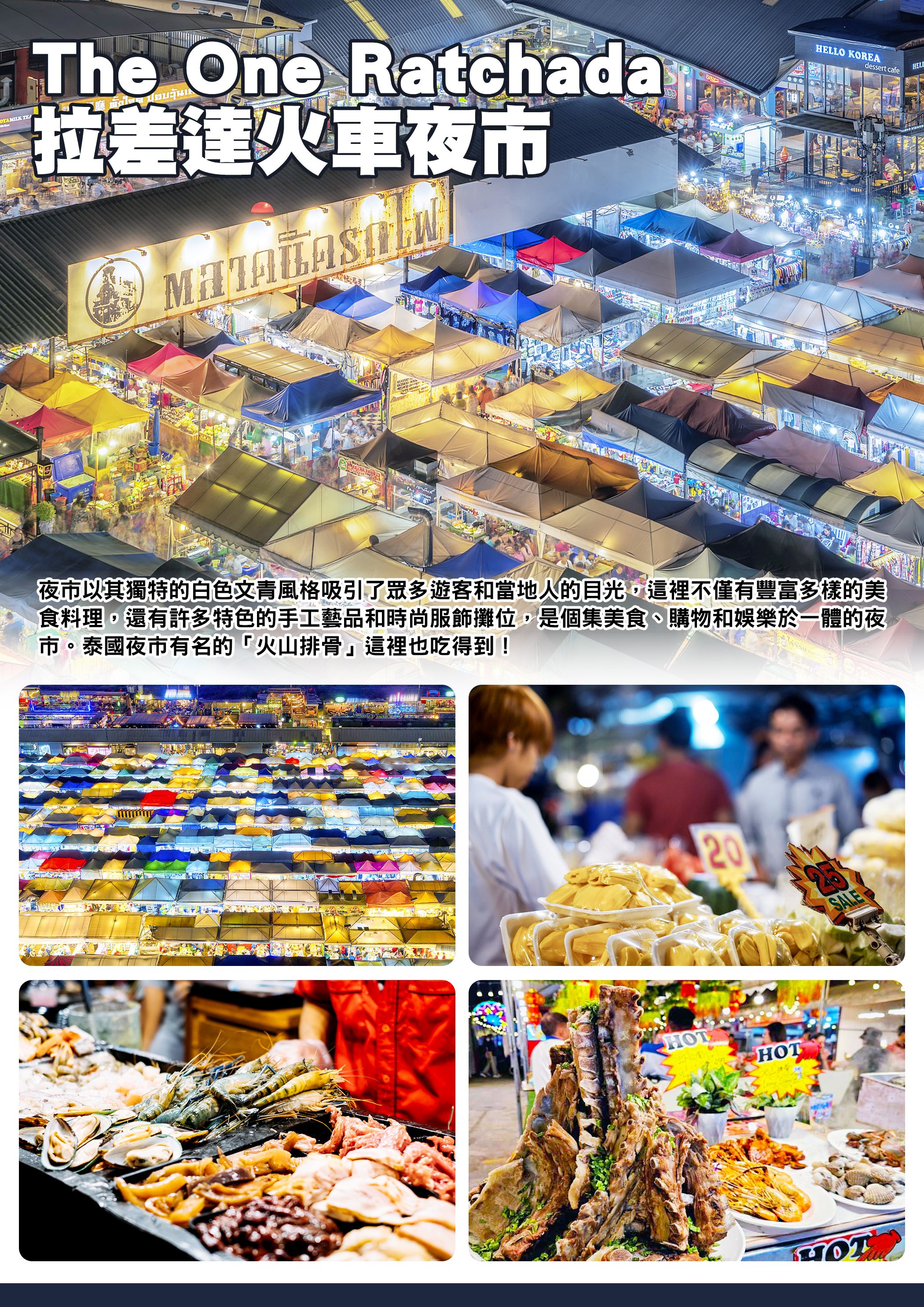 【The One Ratchada拉差達火車夜市】夜市以其獨特的白色文青風格吸引了眾多遊客和當地人的目光,這裡不僅有豐富多樣的美食料理,還有許多特色的手工藝品和時尚服飾攤位,是個集美食、購物和娛樂於一體的夜市。泰國夜市有名的「火山排骨」這裡也吃得到,無論是想要品嘗道地美食、與朋友一起喝1杯,還是尋找獨特的紀念品,「The One Ratchada」夜市都能滿足你的需求。