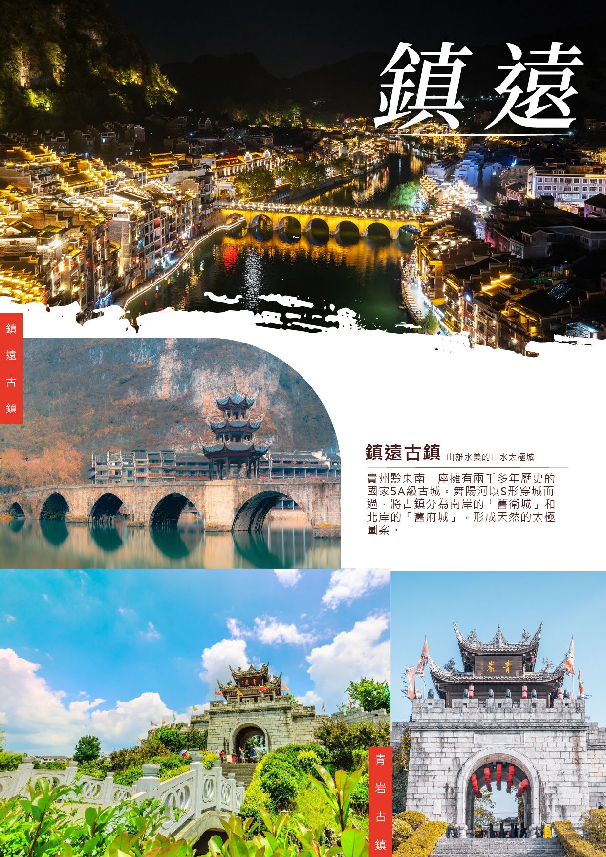 位於黔東南周鎮遠縣,舞陽河畔,河水蜿蜒著以“S”形穿城而過,形成一個類似太極圖的樣式,故又稱八卦古鎮。鎮遠縣城被舞陽河一分為二,北岸是舊時士兵駐紮的地方,稱之為衛城;南岸是行政機構和平民商家聚集的地方,稱之為府城。至今城裏仍殘留有一些古城牆和城門遺址。
