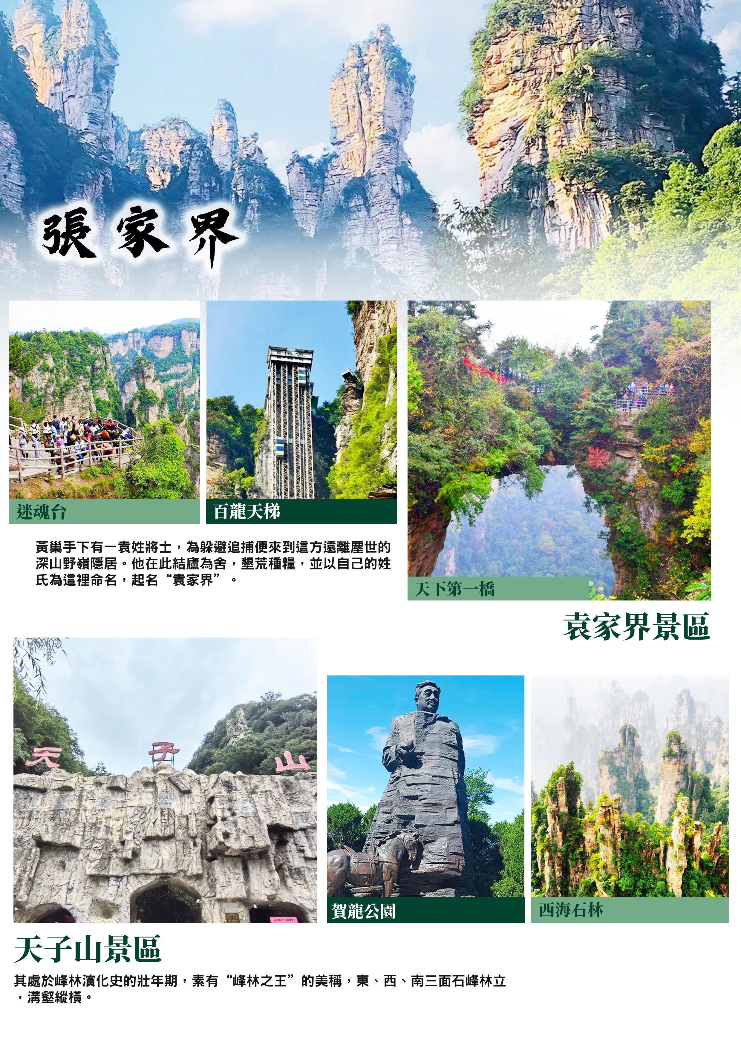 【張家界國家森林公園】位於張家界市武陵源區境內,整個景區面積非常大,分為黃石寨、金鞭溪、袁家界、楊家界、天子山和索溪峪幾大區域。◆百龍天梯(上):垂直高差335米,運行高度326米,採用三台雙層全暴露觀光電梯並列分體運行,每台次載客50人次,運行速度3米/秒。【袁家界景區】是鑲嵌在武陵源核心景區的一顆明珠。相傳後唐時期,黃巢起義失敗後,朝庭為徹底肅清亂黨,四處張榜,捉拿義軍。黃巢手下有一袁姓將士,...