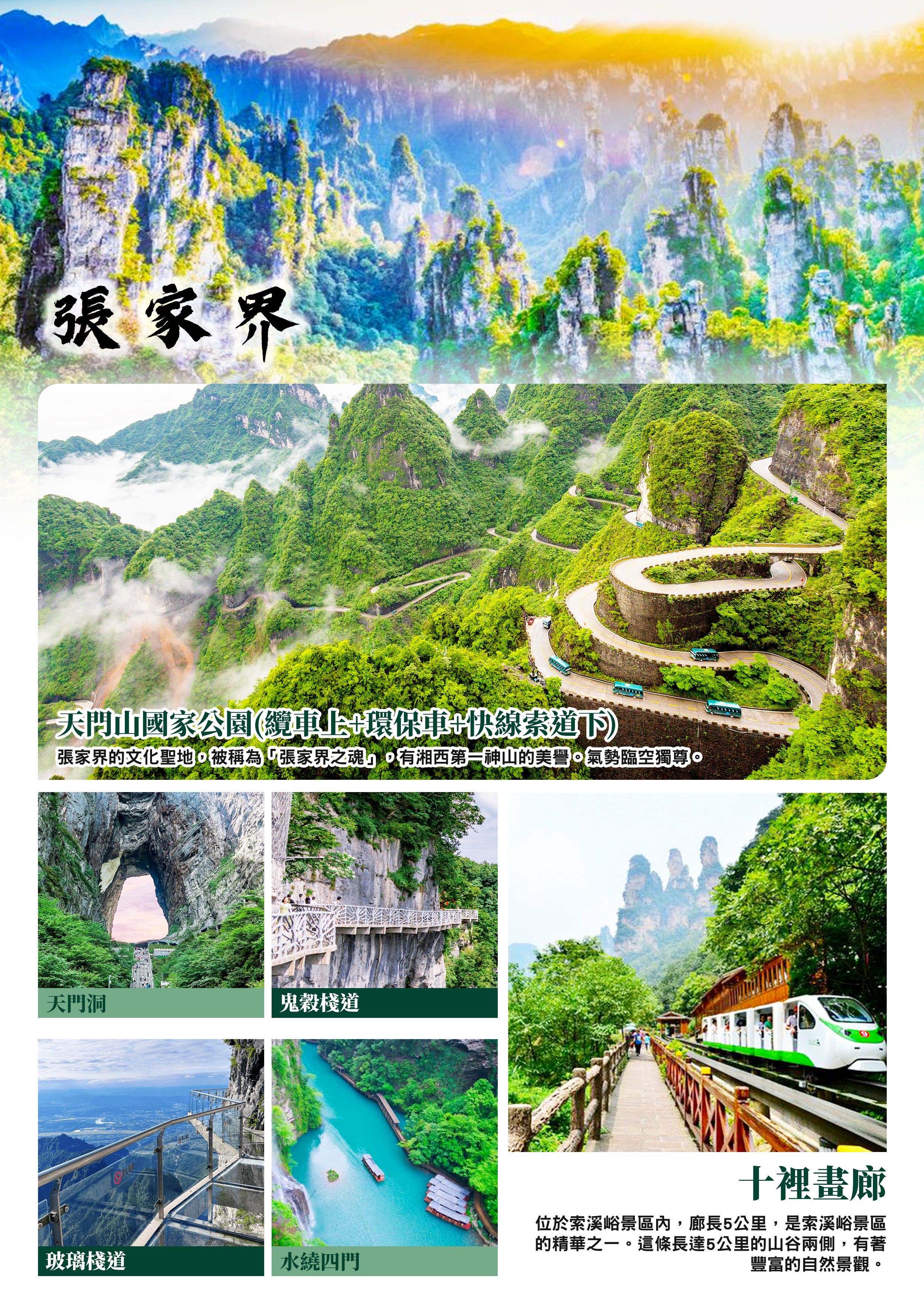 【金鞭溪精華段】位於湖南省張家界國家森林公園,是一條長約 7.5 公里的著名峽谷旅遊線路,以溪水清澈、奇峰挺拔著稱,被譽為「世界上最美麗的峽谷之一」和「山水畫廊」。【水繞四門】因金鞭溪、礦洞溪、鴛鴦溪、龍尾溪四條溪流在這塊不足200平方米的山谷盆地裡盤繞匯流而得名。置身其中,但見“水在山間流,人似水中游”,可稱天下絕景。【十裡畫廊(含雙程小火車)】位於索溪峪景區內,廊長5公里,是索溪峪景區的精華之...