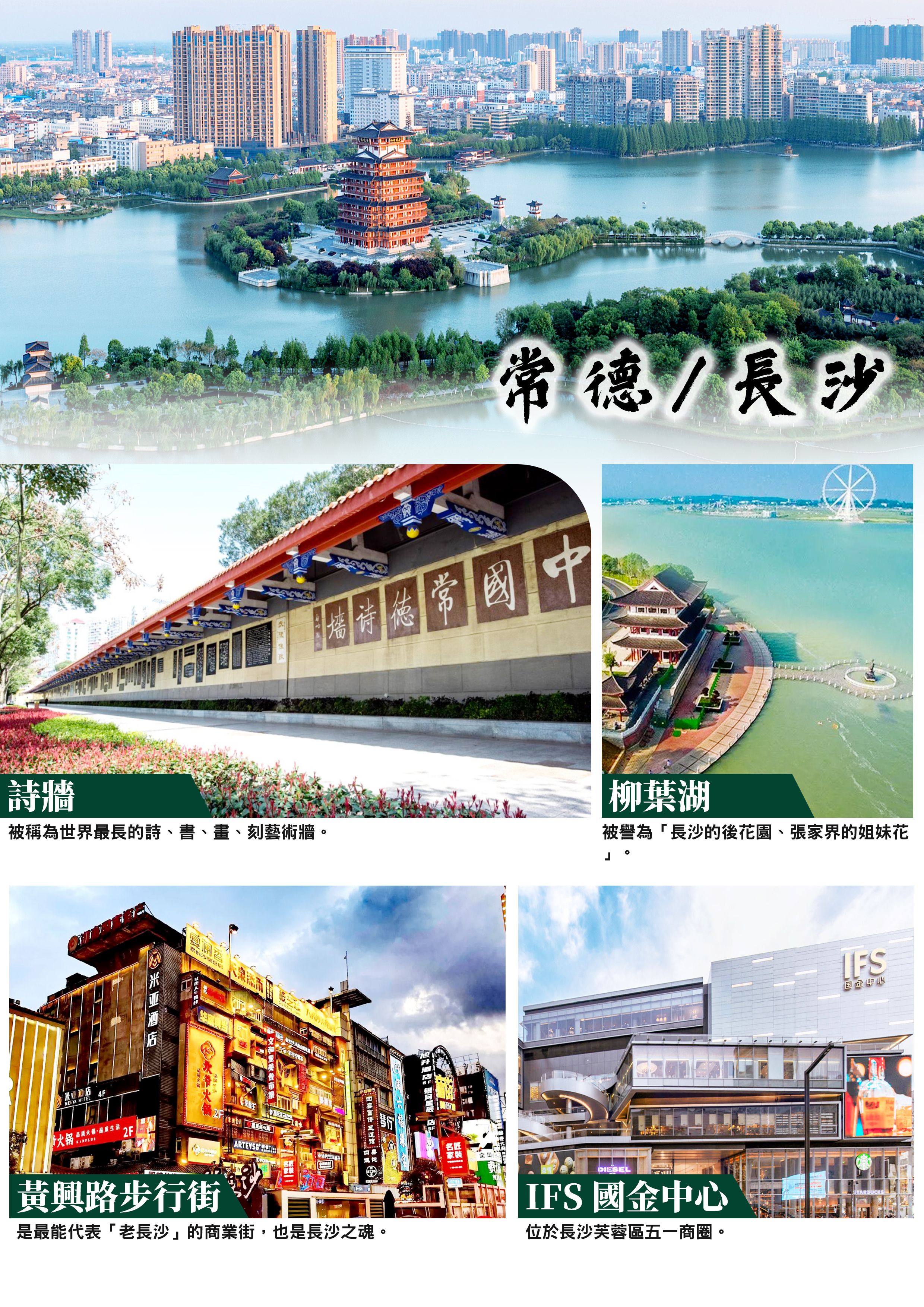 【柳葉湖】是湖南省最大的山、水、城三位一體的生態型城市旅遊休閒度假區,國家首批AAA級景區,是目前中國最大的城市湖泊之一,被譽為「長沙的後花園、張家界的姐妹花」。【詩牆】是常德素稱文物之鄉,投資一億零八百萬元,以2.92公里長的防洪牆為載體,修建一座旨在弘揚中華傳統文化,加強愛國主義教育的詩牆,命名為“中國常德詩牆”。詩牆薈萃了中國當代名家詩詞、書法、美術精品鐫刻於一牆,被稱為世界最長的詩、書、畫...