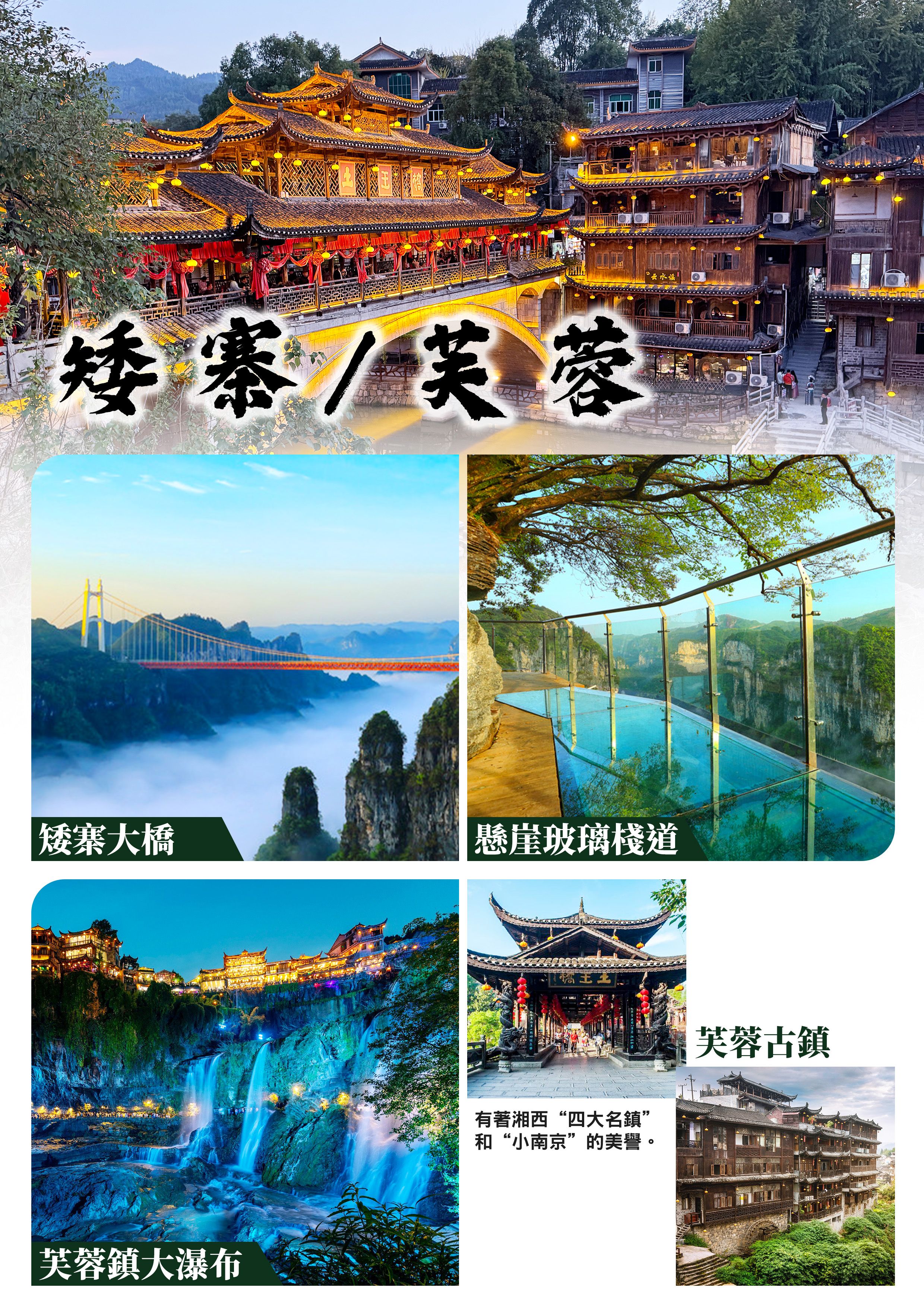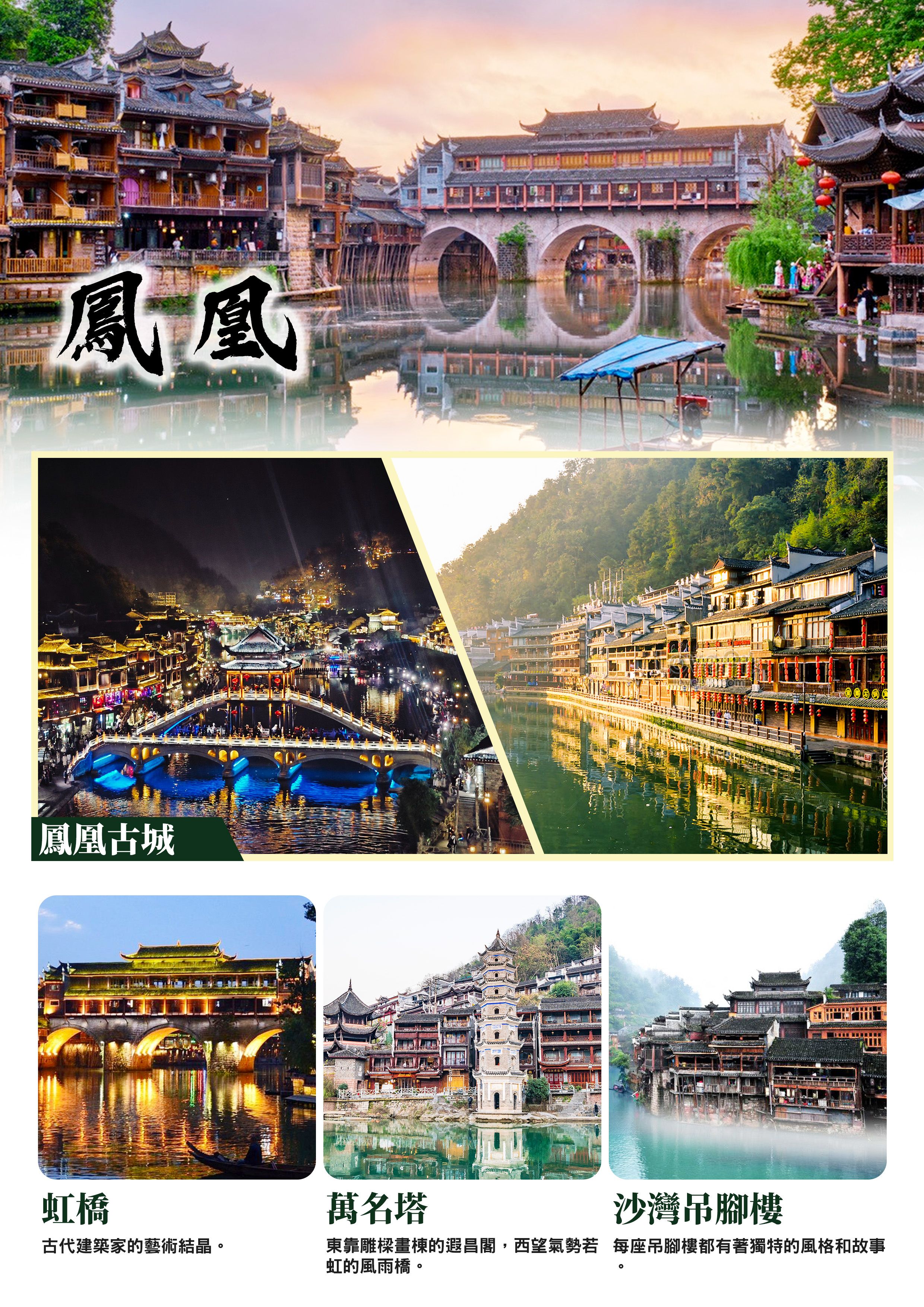 【三生天橋(含電梯)】位於重慶武隆區仙女山鎮,是重慶直轄市級風景名勝區,重慶武隆岩溶國家地質公園的一部分,也被評為中國國家5A級旅遊景區。【鳳凰古城】中國歷史文化名城,曾被新西蘭著名作家路易·艾黎稱讚為中國美麗的小城,與雲南麗江古城、山西平遙古城媲美,享有“北平遙,南鳳凰”之美譽,古城建於清康熙時,因沈從文的小說《邊城》而聞名於世。城內的青石板街道、沱江邊的吊腳樓、眾多的古建築,以及濃厚的苗族風情...
