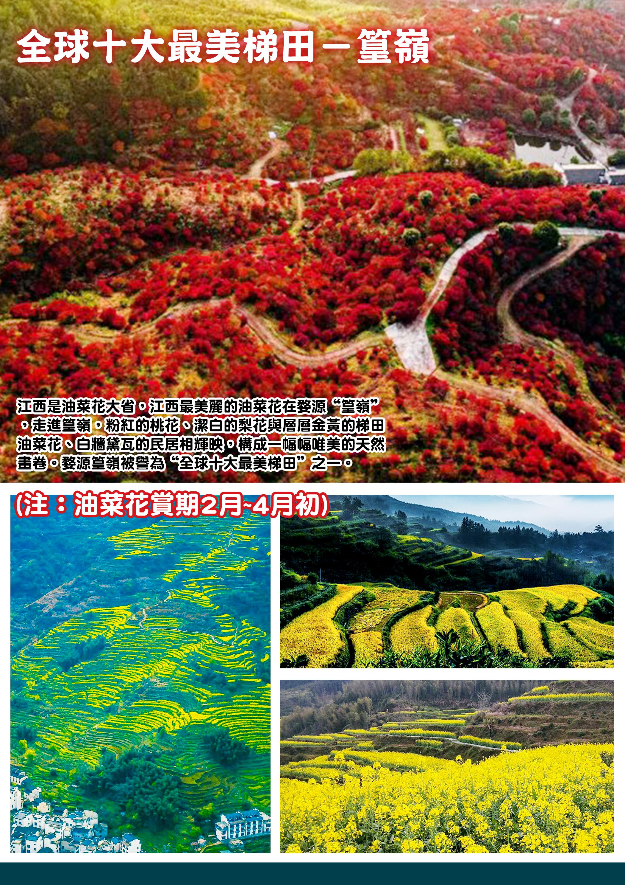 【中國最美的鄉村-婺源】也有人說它是「最後的香格里拉」,這裡處處美景,猶如一個詩情畫意的大公園,擁有許多保存良好的古村落,與青山綠水、粉牆黛瓦、飛簷翹角,構成一幅幅的畫卷。【全球十大最美梯田-篁嶺(含纜車)】江西是油菜花大省,江西最美麗的油菜花在婺源“篁嶺”,走進篁嶺,粉紅的桃花、潔白的梨花與層層金黃的梯田油菜花、白牆黛瓦的民居相輝映,構成一幅幅唯美的天然畫卷。婺源篁嶺被譽為“全球十大最美梯田”之...