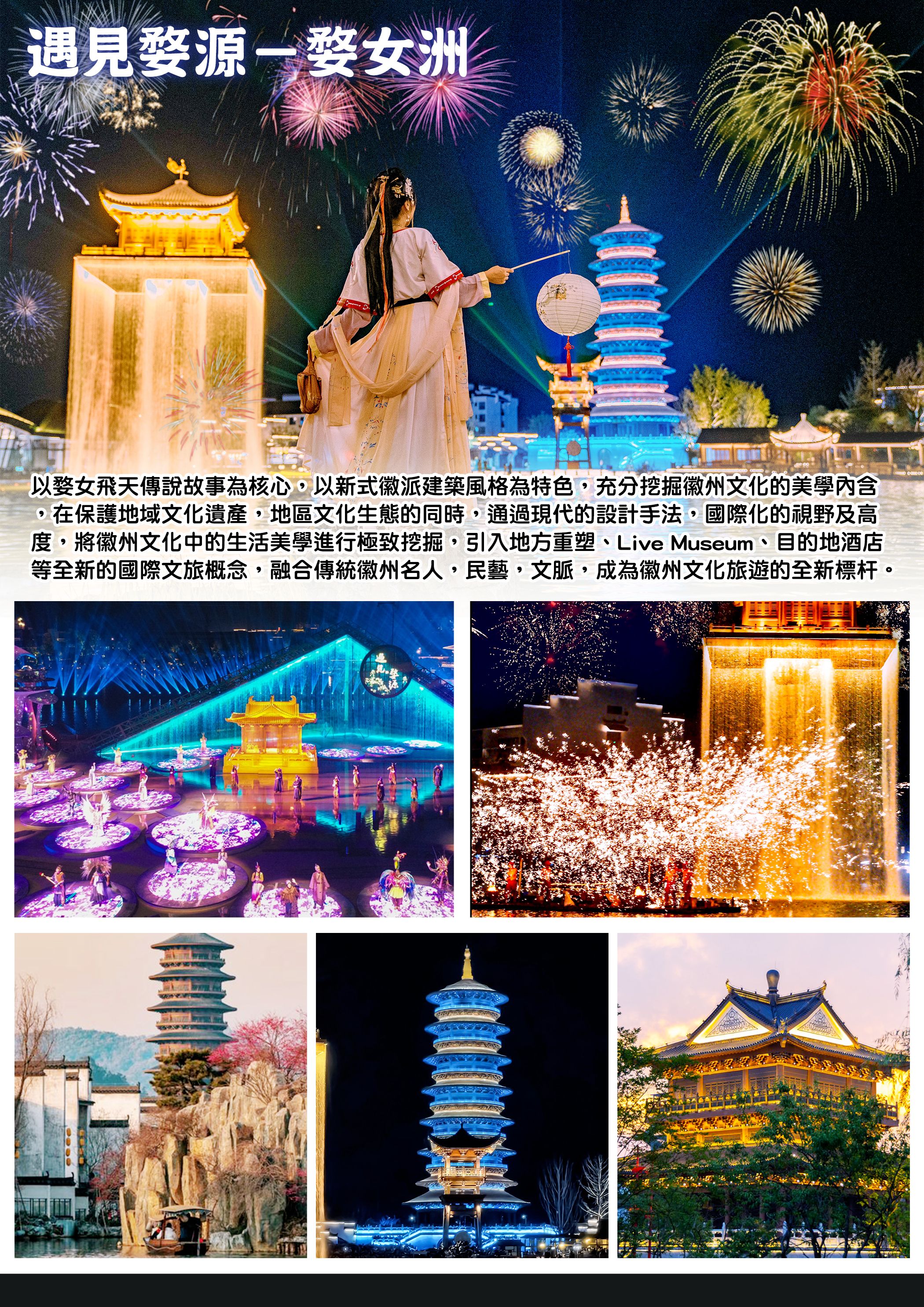 以婺女飛天傳說故事爲核心,以新式徽派建築風格爲特色,充分挖掘徽州文化的美學內含,在保護地域文化遺産,地區文化生態的同時,通過現代的設計手法,國際化的視野及高度,將徽州文化中的生活美學進行極致挖掘,引入地方重塑、Live Museum、目的地酒店等全新的國際文旅概念,融合傳統徽州名人,民藝,文脈,成爲徽州文化旅遊的全新標杆。
