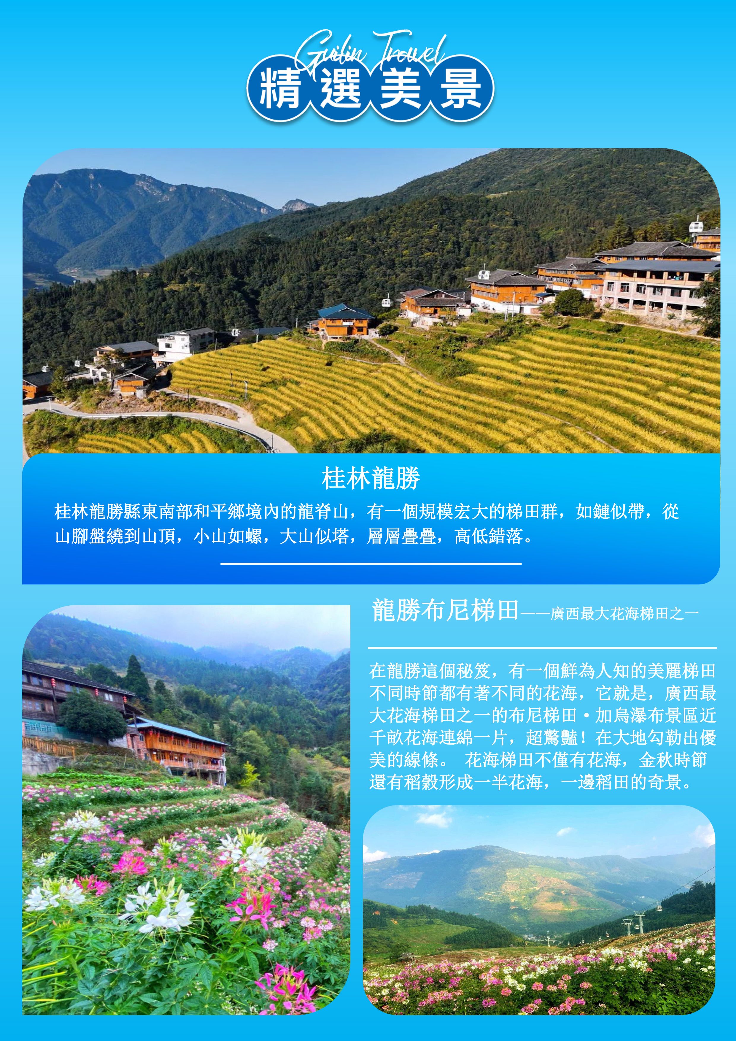 ■【龍勝布尼梯田、加烏瀑布】(遊覽時間約120分鐘)桂林龍勝縣東南部和平鄉境內的龍脊山,有一個規模宏大的梯田群,如鏈似帶,從山腳盤繞到山頂,小山如螺,大山似塔,層層疊疊,高低錯落。其線條行雲流水,瀟灑柔暢;其規模磅礴壯觀,氣勢恢弘,有"梯田世界之冠"的美譽,這就是龍脊梯田。梯田如鏈似帶,把一座座山峰環繞成一只只巨大的螺螄,有的像巨扇一樣半摺半開,斜疊成一個個狹長的扇;有的則像天鏡被分割,然後有層次...