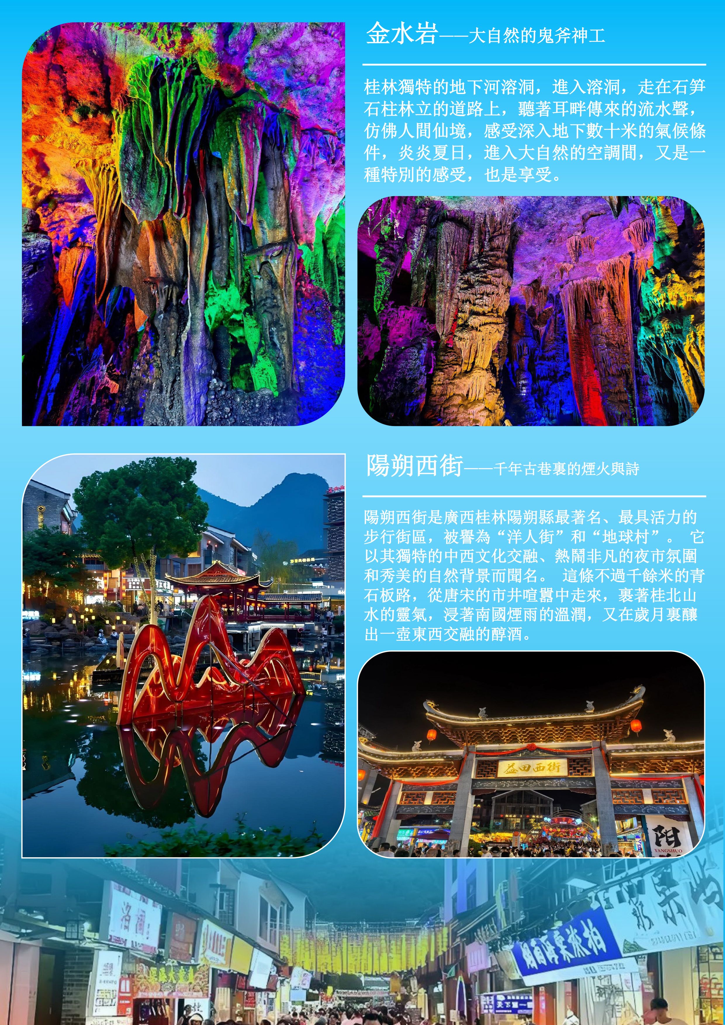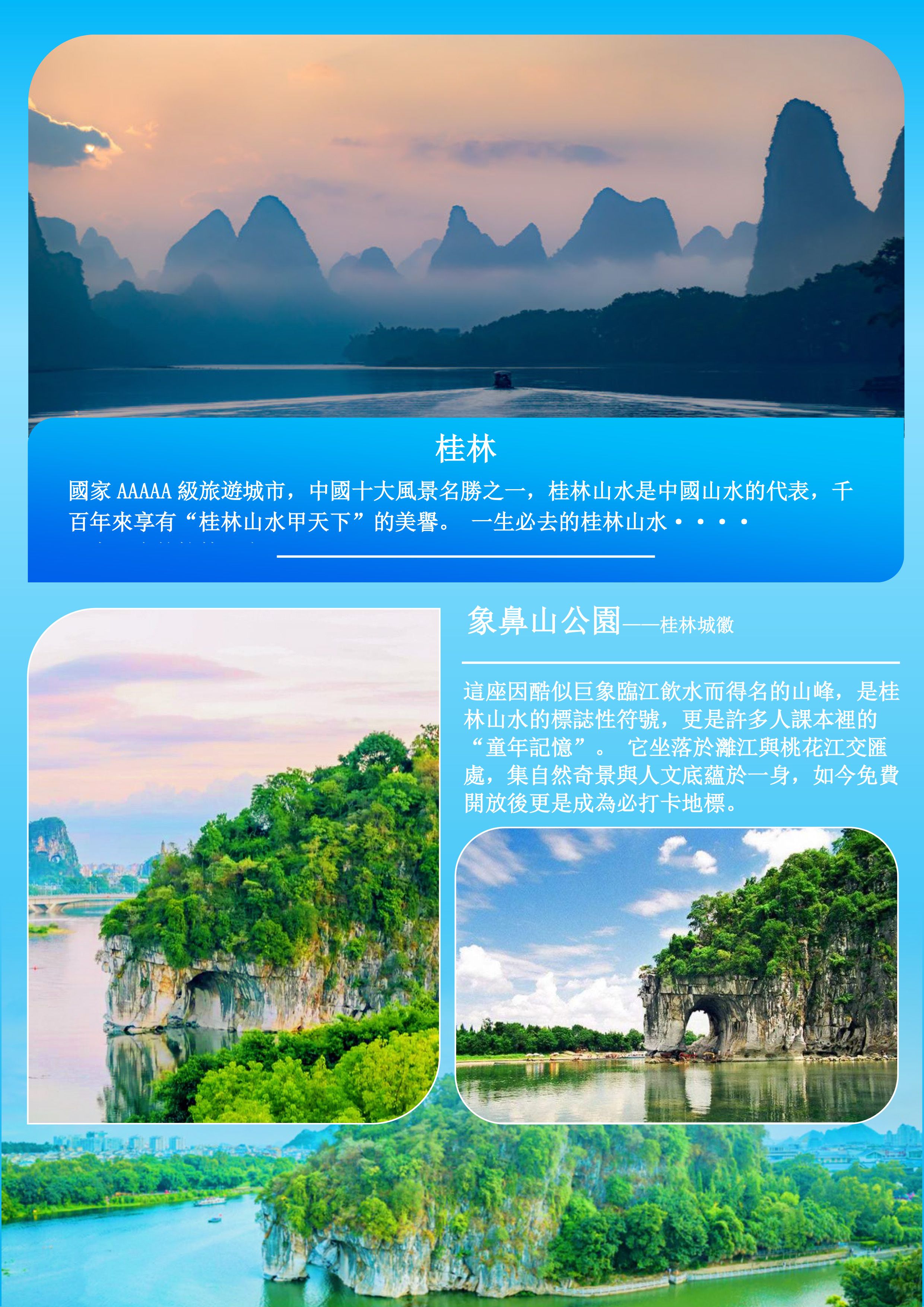 建議自費:(自由選擇參加,不强迫)1、堯山景區(含纜車上下)+玄幻山水間秀(VIP席)+足底按摩+車夜遊兩江四湖=2300 NT/人2、印象劉三姐秀(新貴賓席位)或者千古情秀=1800 NT/人◆本行程酒店所指住宿為 2 人一室,依旅行社取得房行為準,不可指定房型,若指定單人房必須補繳單人房差NT8000 元。 出發日期:114/11/2-115/5/25起每周日出發,1.跨年12/28加價NT1000/人2.春節115/2/15出發加價5000/人◆【參考航班】:去程:大灣區航空 HB703 桃園(TPE)/香港(HKG) 10:55 - 12:55 大灣區航空 HB530 香港/桂林 15:20 -16:50回程:大灣區航空 HB531 桂林/香港 17:50 -19:20 (第五天) 大灣區航空 HB704 香港(HKG)/桃園(TPE) 18:30 - 20:20(第六天)...
