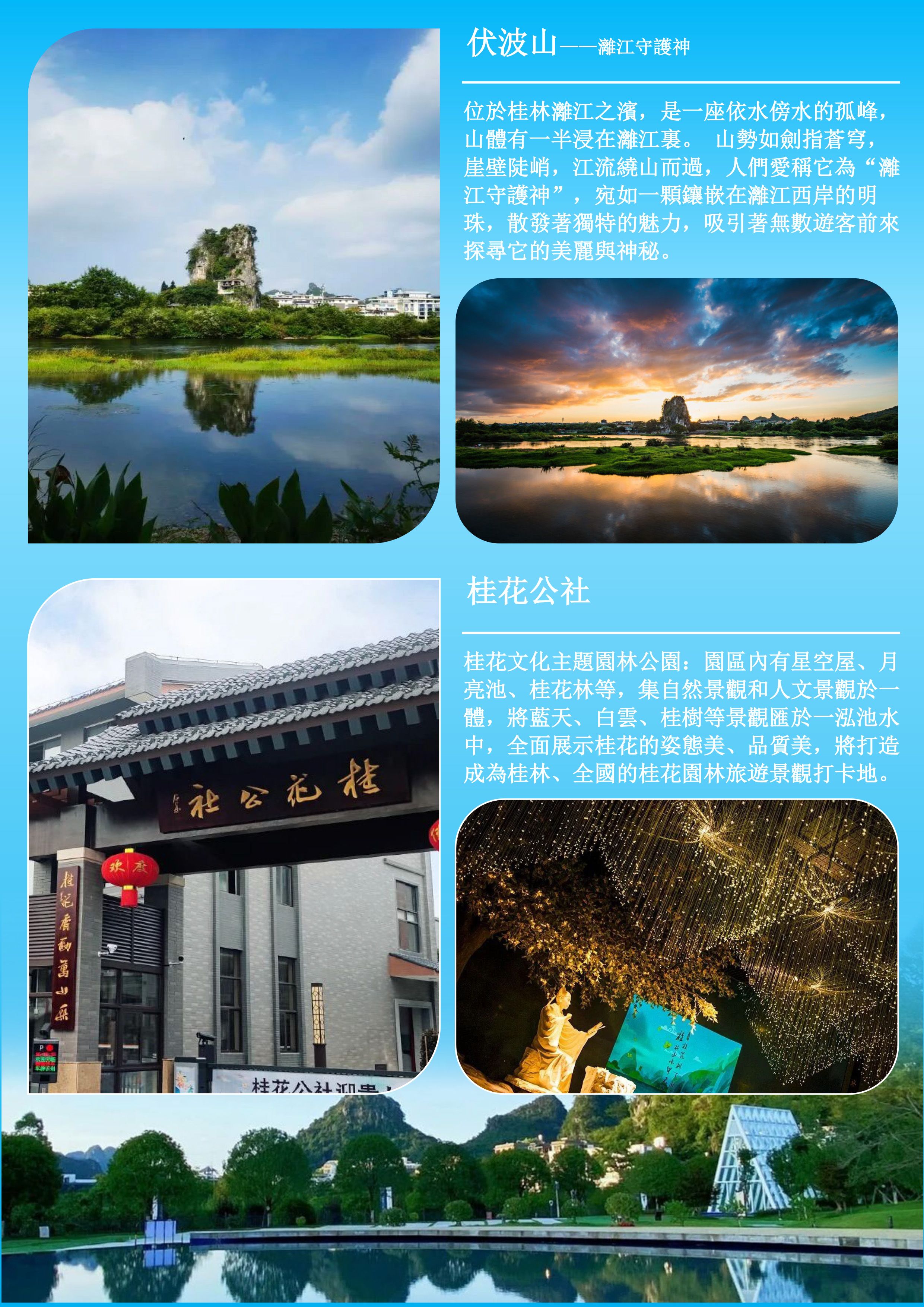 ■【伏波山】(遊覽時間約60分鐘)早餐後前往遊覽伏波山又因孤峰雄峙,半枕陸地,半插江潭,遏阻洄瀾,有"伏波勝景"之美稱。每年春夏,江水暴漲,山麓遏阻急浪狂瀾,使江水倒轉迴旋,有降伏波濤之力。■【桂花公社】(遊覽時間約90分鐘)桂花文化主題園林公園:園區內有星空屋、月亮池、桂花林等,集自然景觀和人文景觀於一體,將藍天、白雲、桂樹等景觀匯於一泓池水中,全面展示桂花的姿態美、品質美,將打造成為桂林、全國...