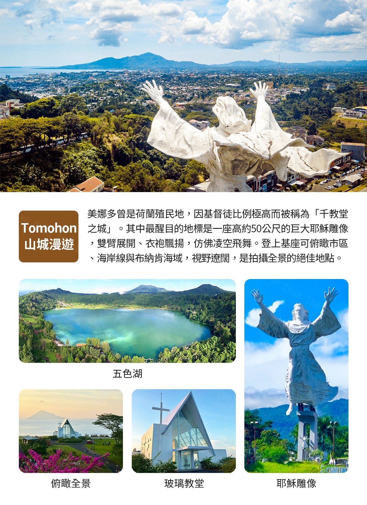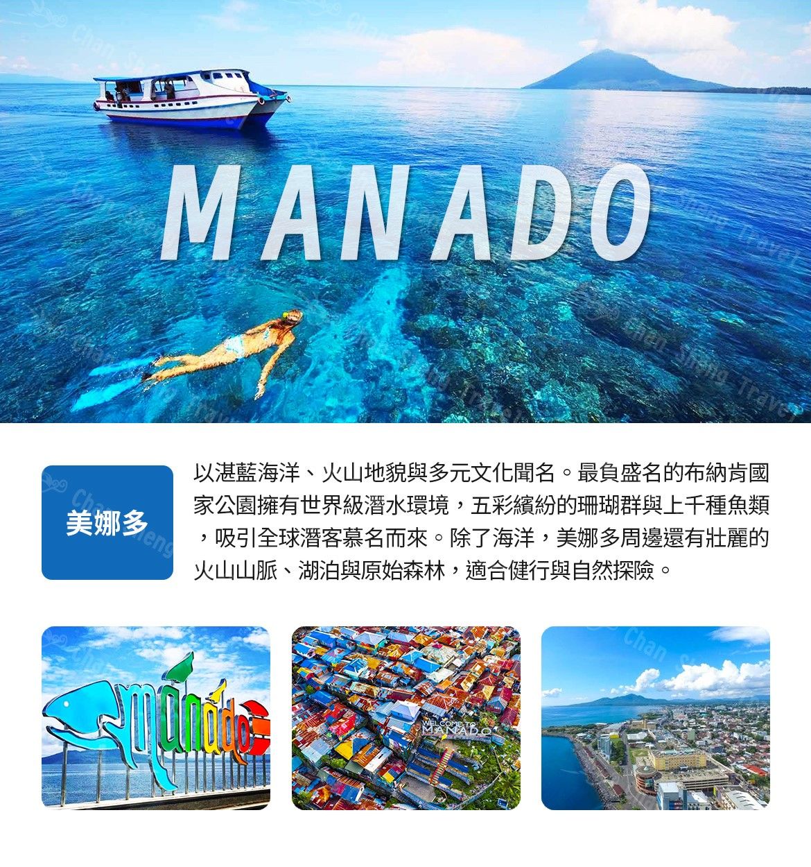 今日集合於桃園國際機場,搭乘空中巴士客機直飛前往印尼【Manado 美娜多】,展開北蘇拉威西五天四夜度假之旅。 【印尼北蘇拉威西的珍寶 – Manado 美娜多】想像一座面海靠山的城市:清晨陽光灑落在碧藍海面,午後微風吹拂自火山高地,夜晚滿天星斗伴隨海浪聲,彷彿走進一幅熱帶明信片。美娜多以世界級 布納肯海洋國家公園、壯麗火山高地、迷人湖泊及充滿活力的在地文化聞名,不僅是旅行,更是自然與人...