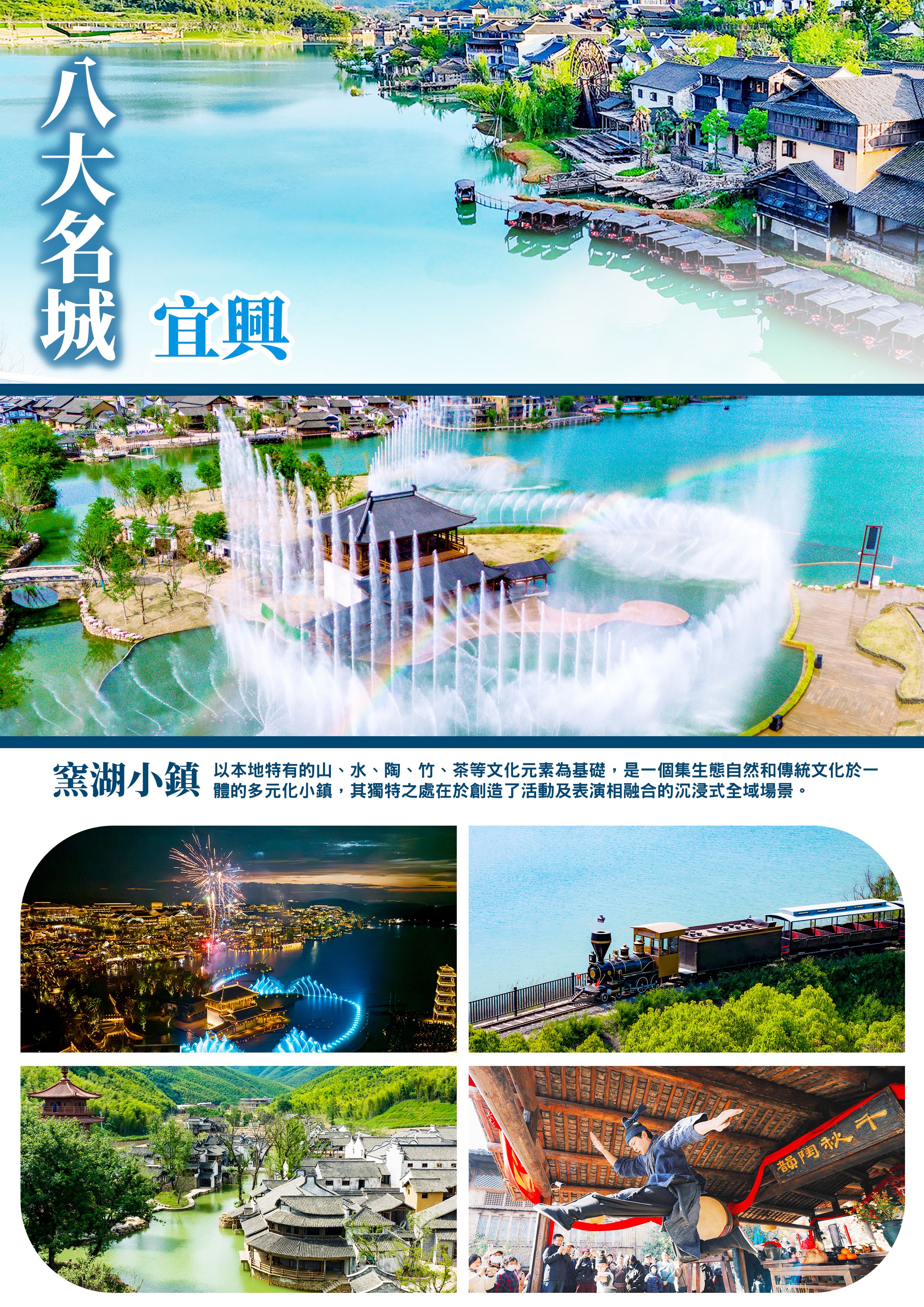 以本地特有的山、水、陶、竹、茶等文化元素為基礎,是一個集生態自然和傳統文化於一體的多元化小鎮,其獨特之處在於創造了活動及表演相融合的沉浸式全域場景,塑造了非遺手工技藝和禪意生活美學相結合的特色體驗。