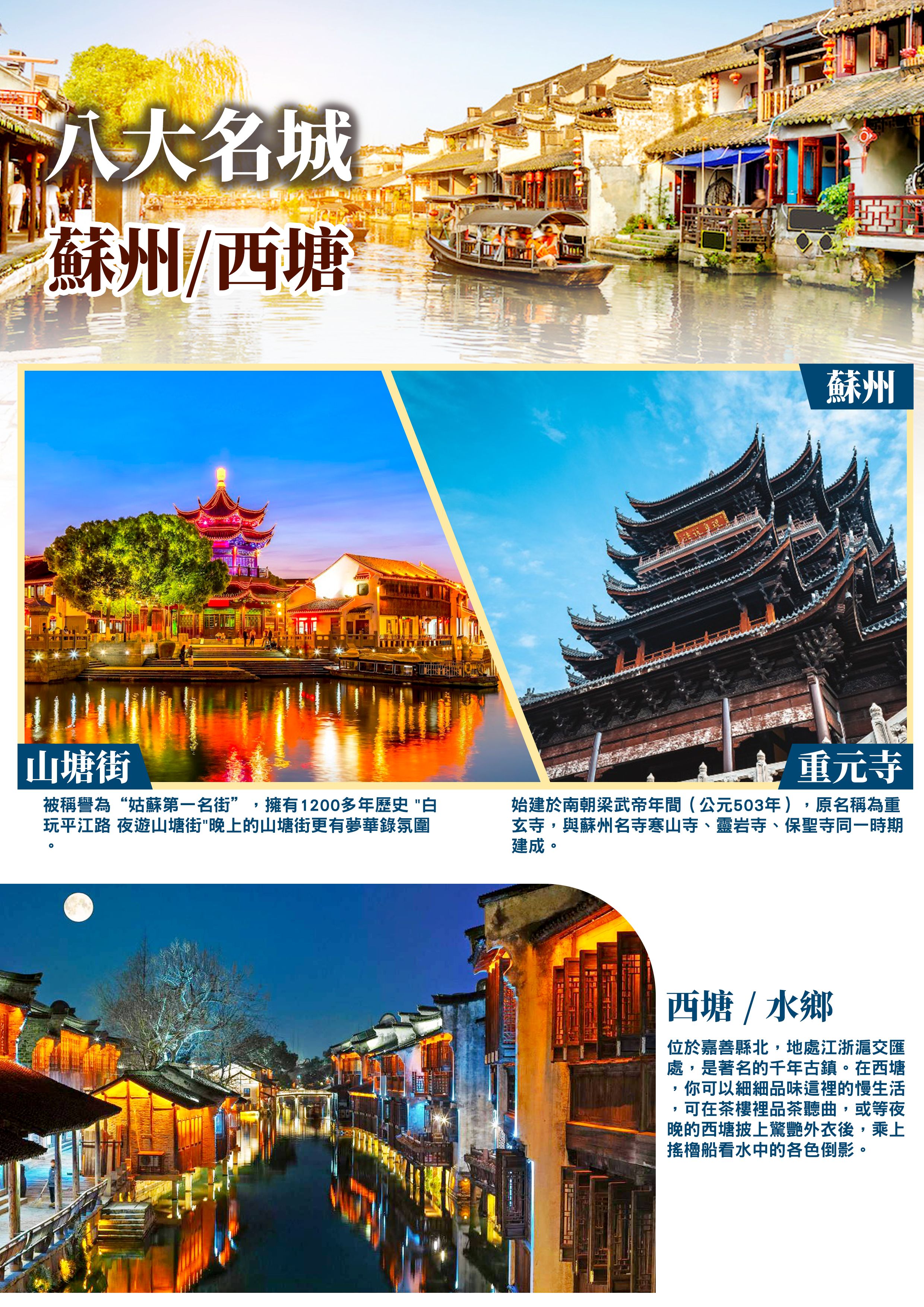 【珍珠展覽館】在此有珍珠的相關知識,從養殖、分級鑒定、首飾設計與加工及珍珠藝術品的展示區域,展品超過200件。(館內展品除參觀外,有部分可銷售,可自由選購)【重元寺】始建於南朝梁武帝年間(公元503年),原名稱為重玄寺,與蘇州名寺寒山寺、靈岩寺、保聖寺同一時期建成,距今已有逾1,500年歷史。與大多寺廟建於群山峻嶺之中不同,重元寺臨水而建,佇立在風景秀美的陽澄湖半島之中,一部分建築建於湖中,通過一...