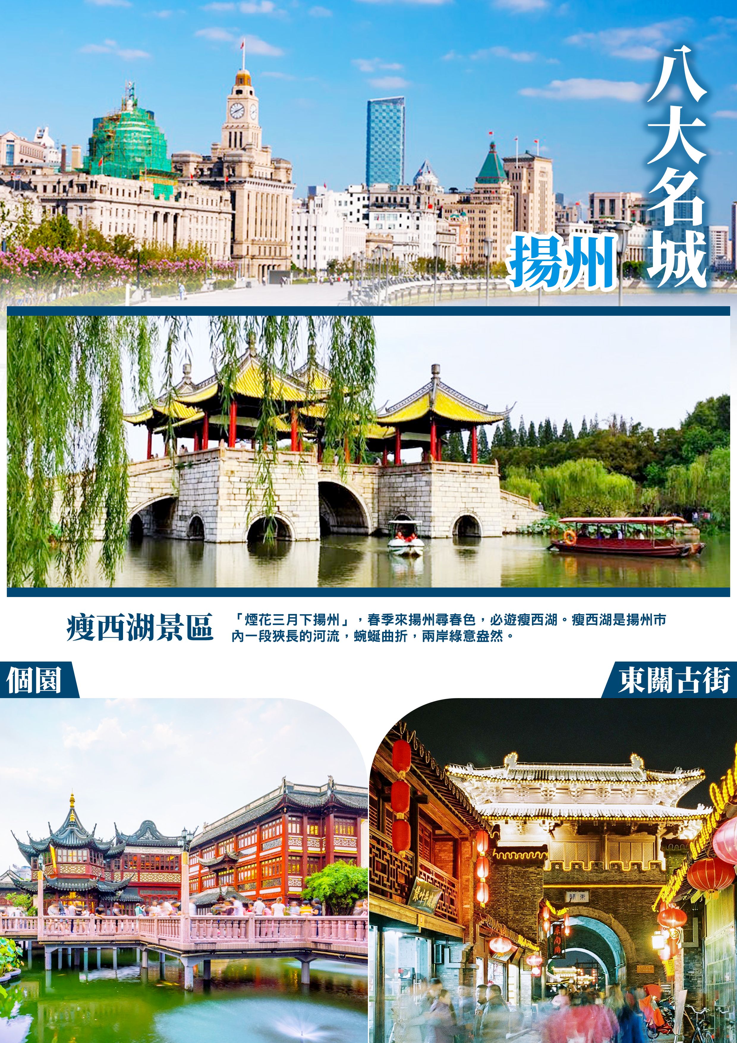 【瘦西湖景區】國家AAAAA級旅遊區,「煙花三月下揚州」,春季來揚州尋春色,必遊瘦西湖。瘦西湖是揚州市內一段狹長的河流,蜿蜒曲折,兩岸綠意盎然。這裡還曾是清代乾隆皇帝下江南時的必遊之處,如今看到的大虹橋、釣魚台、白塔、熙春台等建築景觀,都留下了與乾隆皇帝不可分割的典故,都說「揚州出美女」,這兒的美女導遊也是景區內的一道亮麗風景線。【金山寺】充滿歷史傳說與神話故事,古人贊為"江南名勝之最"。金山寺建...