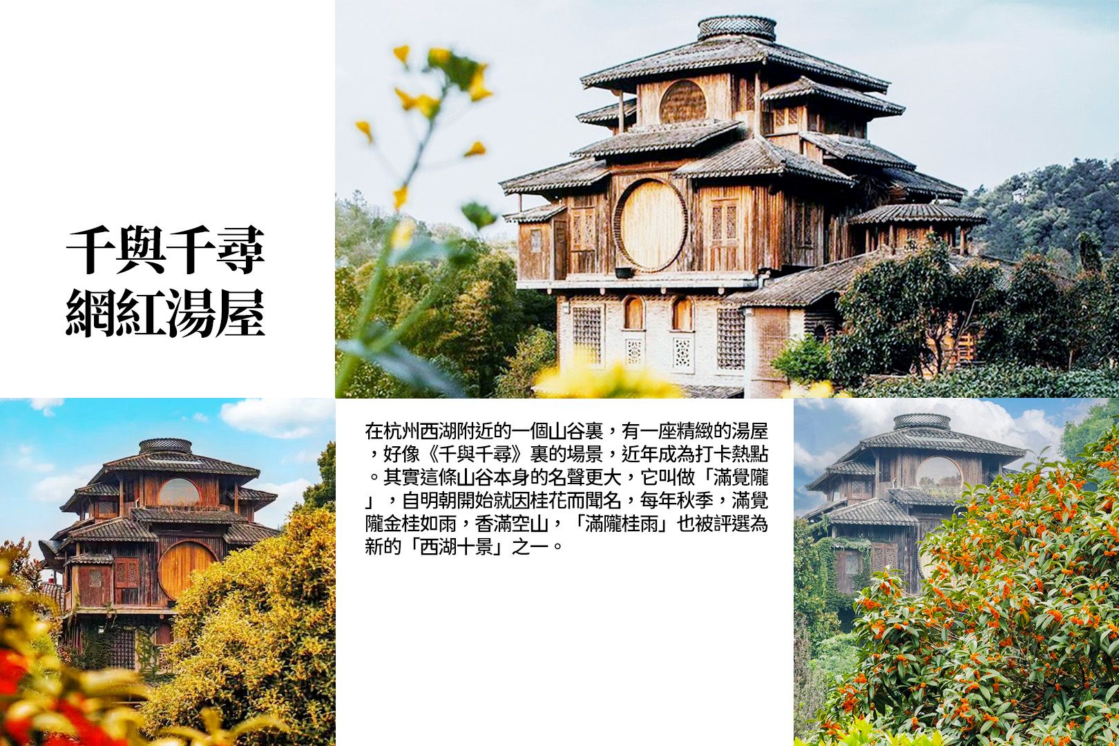 在杭州西湖附近的一個山谷裏,有一座精緻的湯屋,好像《千與千尋》裏的場景,近年成為打卡熱點。其實這條山谷本身的名聲更大,它叫做「滿覺隴」,自明朝開始就因桂花而聞名,每年秋季,滿覺隴金桂如雨,香滿空山,「滿隴桂雨」也被評選為新的「西湖十景」之一。