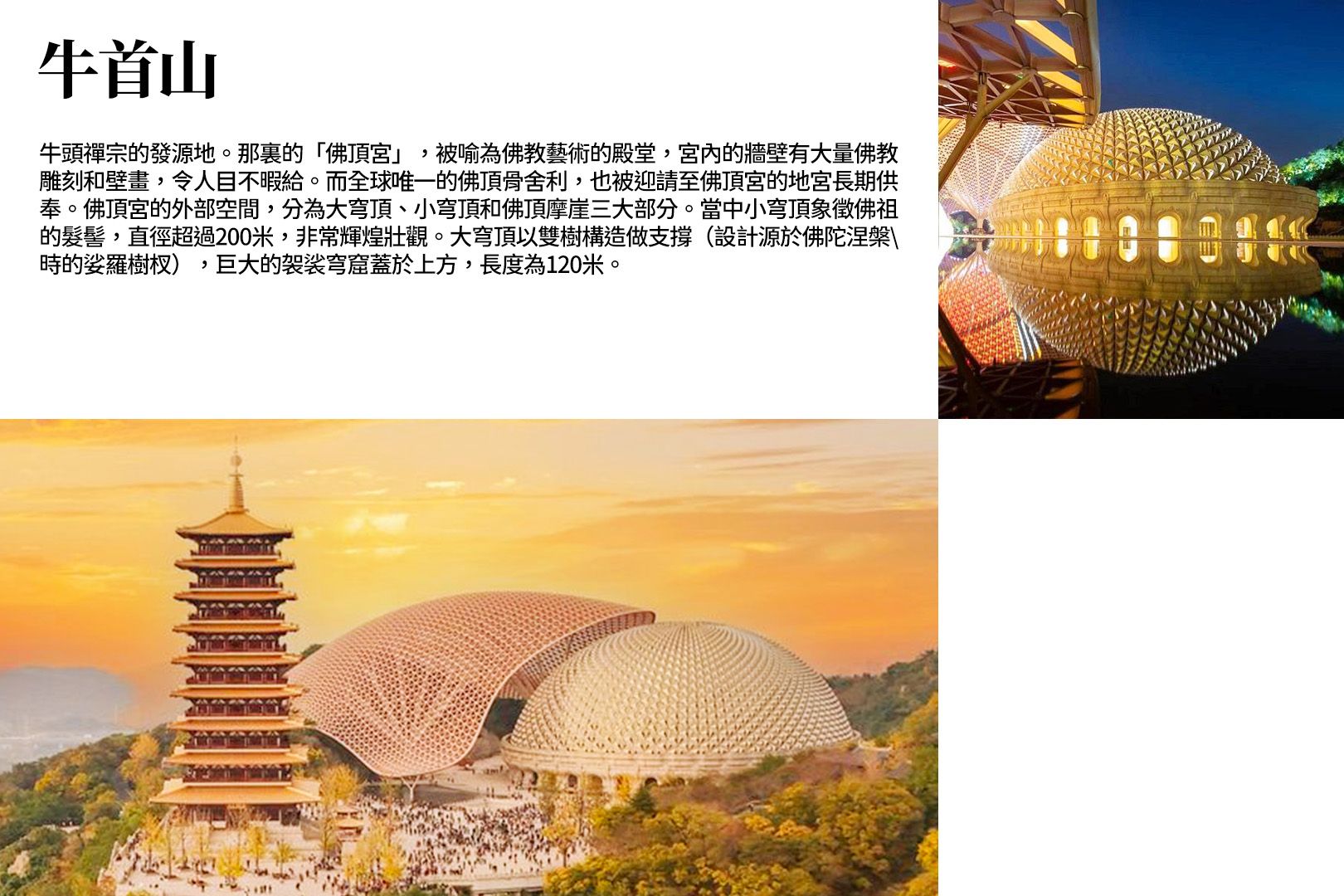 牛首山,是牛頭禪宗的發源地。那裏的「佛頂宮」,被喻為佛教藝術的殿堂,宮內的牆壁有大量佛教雕刻和壁畫,令人目不暇給。而全球唯一的佛頂骨舍利,也被迎請至佛頂宮的地宮長期供奉。佛頂宮的外部空間,分為大穹頂、小穹頂和佛頂摩崖三大部分。當中小穹頂象徵佛祖的髮髻,直徑超過200米,非常輝煌壯觀。大穹頂以雙樹構造做支撐(設計源於佛陀涅槃時的娑羅樹杈),巨大的袈裟穹窟蓋於上方,長度為120米。