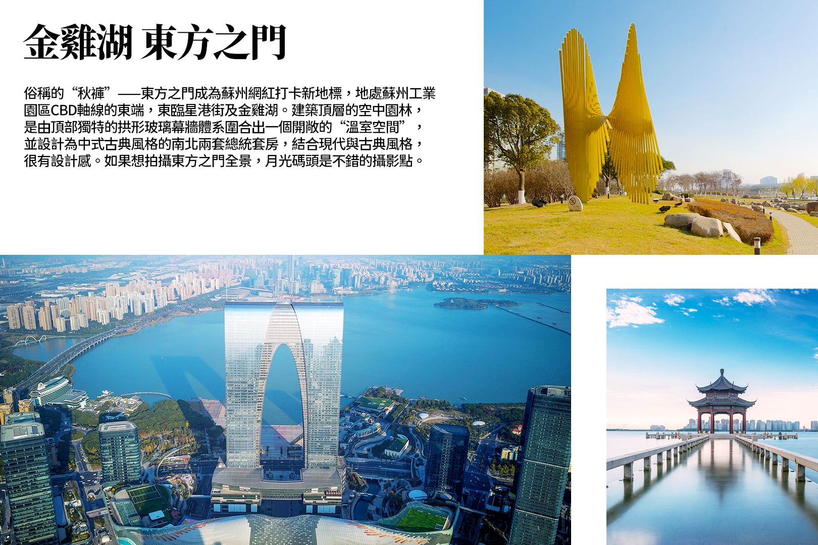 俗稱的“秋褲”——東方之門成為蘇州網紅打卡新地標,地處蘇州工業園區CBD軸線的東端,東臨星港街及金雞湖。建築頂層的空中園林,是由頂部獨特的拱形玻璃幕牆體系圍合出一個開敞的“溫室空間”,並設計為中式古典風格的南北兩套總統套房,結合現代與古典風格,很有設計感。如果想拍攝東方之門全景,月光碼頭是不錯的攝影點。