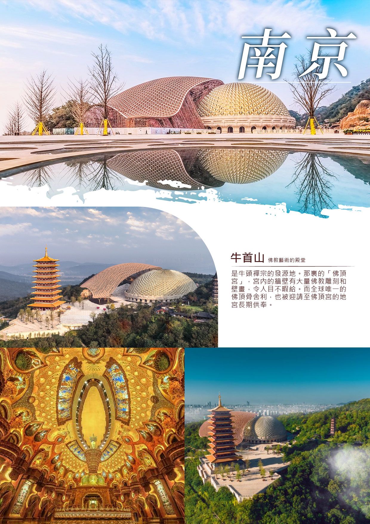 【牛首山+佛頂宮+車】牛首山,是牛頭禪宗的發源地。那裏的「佛頂宮」,被喻為佛教藝術的殿堂,宮內的牆壁有大量佛教雕刻和壁畫,令人目不暇給。而全球唯一的佛頂骨舍利,也被迎請至佛頂宮的地宮長期供奉。佛 頂宮的外部空間,分為大穹頂、小穹頂和佛頂摩崖三大部分。當中小穹頂象徵佛祖的髮髻,直徑超過 200 米,非常輝煌壯觀。大穹頂以雙樹構造做支撐(設計源於佛陀涅槃時的娑羅樹杈),巨大的袈裟穹窟蓋於上方,長度為 ...