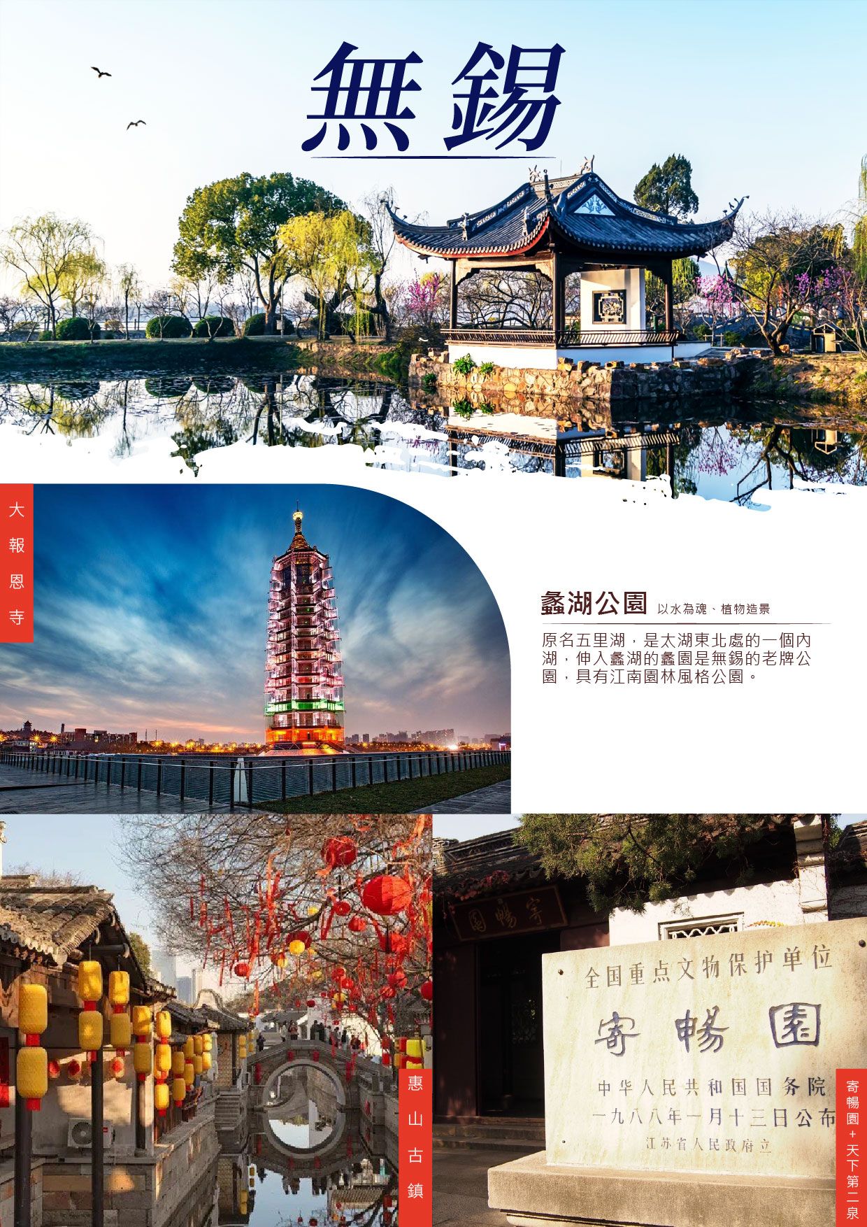 【紫砂藝術博物館】收藏各種年代,各種風格的紫砂陶藝精品約數百件。許多中外遊客及各國國家領導都來此參觀。在此觀看到眾多國家級美術大師的作品展示。購買喜歡的茶具,不論是送禮或自用都是最好的選擇。【蠡湖公園】原名五里湖,是太湖東北處的一個內湖,伸入蠡湖的蠡園是無錫的老牌公園,具有江南園林風 格,以水景見長,細細窄窄的長提、小橋、長廊架於水上,到了 3、4 月份桃花盛開,6-9 月荷花盛開,宛如一座水上花...