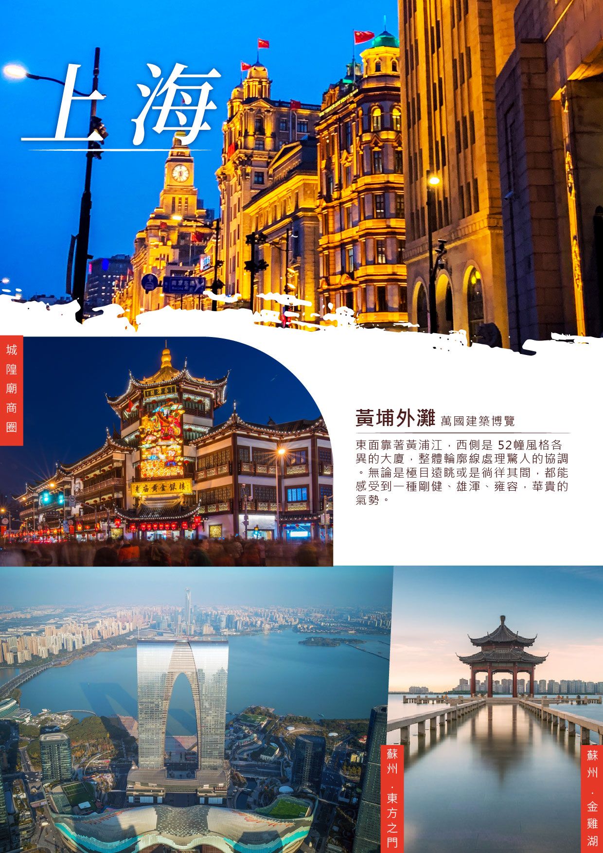 ◆點我報名!! 點我報名!! 點我報名!!線上LINE客服 https://lin.ee/b5zq2gk《參考航班》:✈參考航班(春秋航空)(最終航班以行前説明會資料爲準)去程航班 春秋航空 3C8952 桃園(TPE)/上海(PVG) 11:25-13:25回程航班 春秋航空 3C8951 上海(PVG)/桃園(TPE) 08:25-10:30────────────────────────────────────✈參考航班(南方航空)(最終航班以行前説明會資料爲準)去程航班 CZ3096 桃園(TPE)/上海(PVG) 18:20-20:20回程航班 CZ3095 上海(PVG)/桃園(TPE) 14:50-16:50《團費包含》:1. 桃園/上海/來回經濟艙機票。2. 表列餐食、景點、住宿飯店(兩人一室)、車資。3. 保險:250 萬意外責任險及 20 萬元意外醫療給付旅遊景點 8 ...