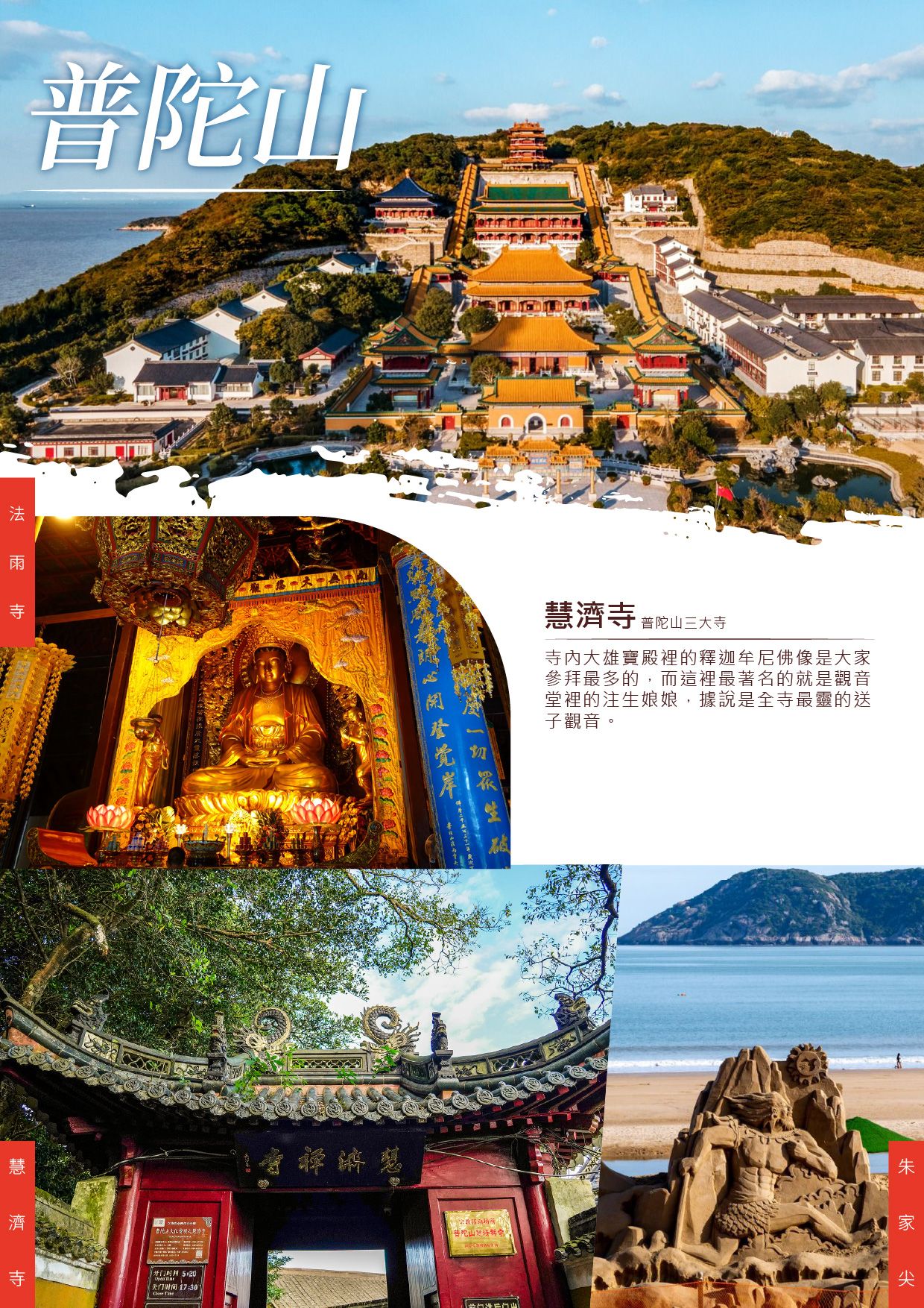 【慧濟寺(含纜車上下)】位於普陀山最高處佛頂山上,因位於佛頂山中間谷地,又稱佛頂山寺,普濟寺和法雨寺一起,並稱為普陀山三大寺。這裡每天都會有很多虔誠的信徒前來參拜,寺內大雄寶殿裡的釋迦牟尼佛像是大家參拜最多的,而這裡最著名的就是觀音堂裡的注生娘娘,據說是全寺最靈的送子觀音,因此每天也有很多人來求子,據說非常之靈驗。【法雨寺】又稱後寺,位於普陀山風景區中部,其規模僅次於“前寺”普濟寺,為普陀三大寺之...