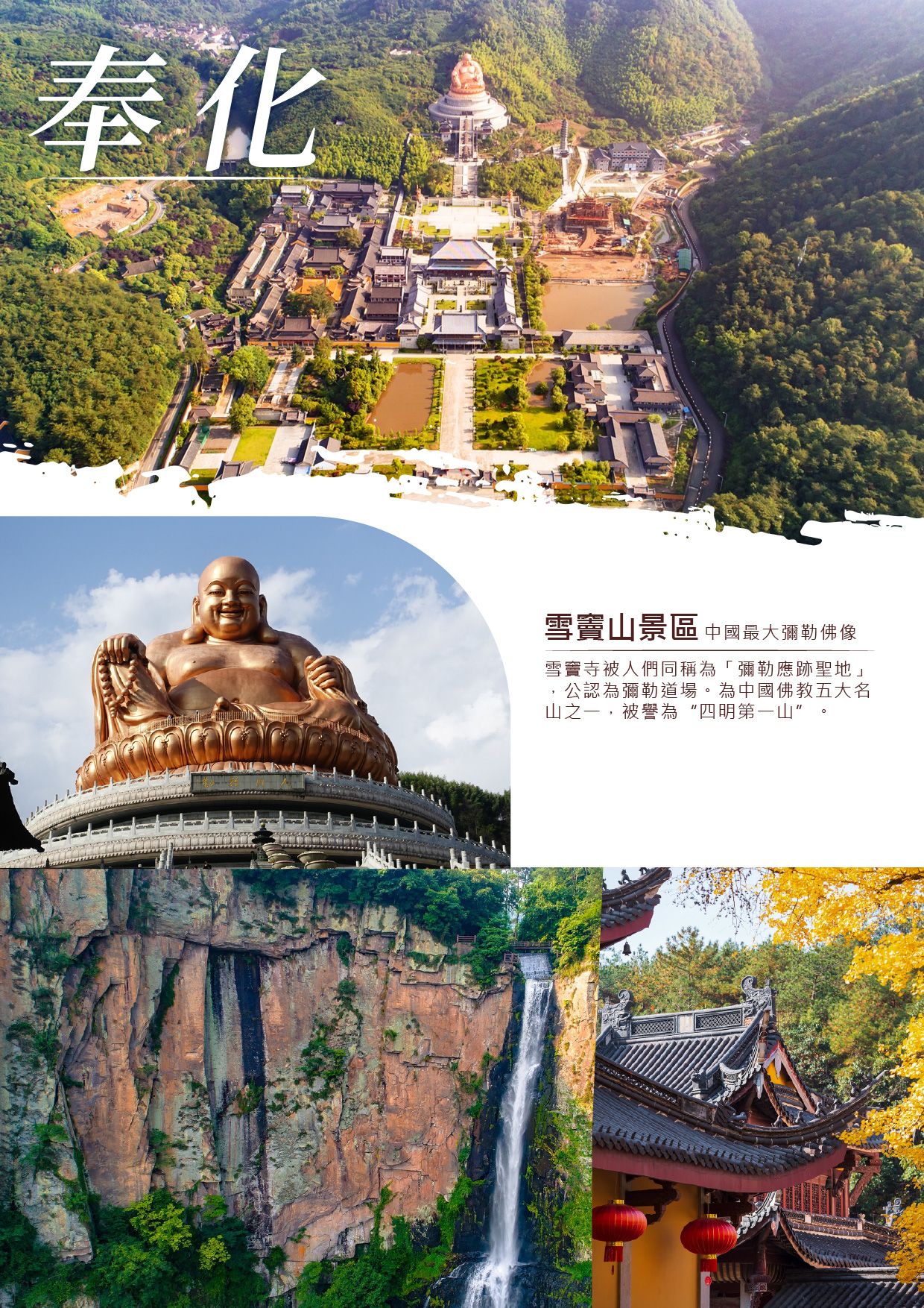 【雪竇山景區】 國家5A級旅遊景區,被譽為「中國佛教第五大名山」,與五台山、普陀山、峨眉山、九華山並列,是彌勒菩薩的應化道場。雪竇山海拔800米,為四明山支脈最高峰,素有「四明第一山」之譽。◆雪竇寺:全稱「雪竇資聖禪寺」,始建於晉朝,已有1700多年歷史,位列「禪宗十剎」。宋真宗賜名「雪竇資聖禪寺」,宋仁宗夢遊此山後題「應夢名山」,南宋被敕封為「五山十刹」之一。寺院依山而建,九峰環抱,有「四面青山...