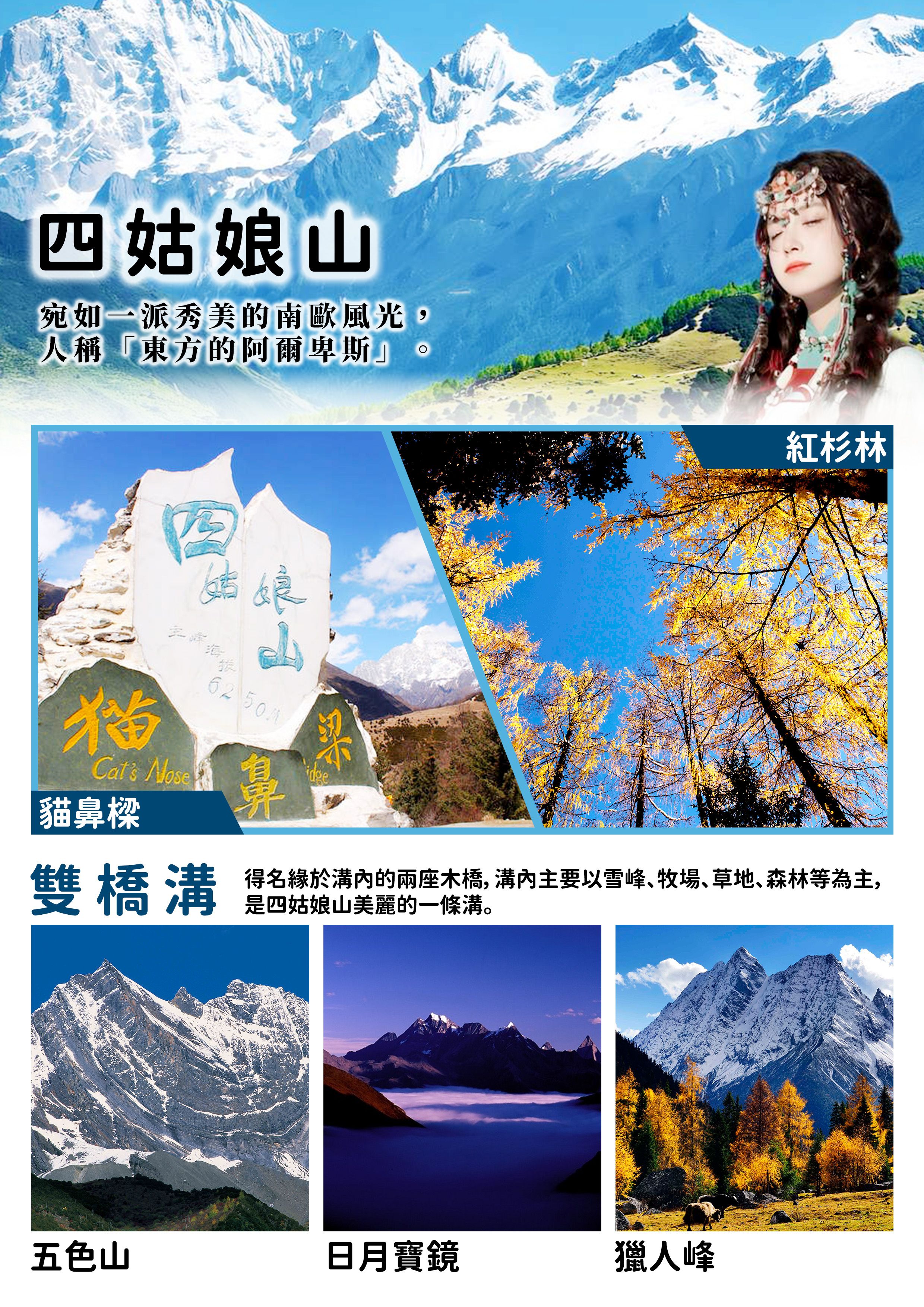 【四姑娘山】於阿壩小金縣日隆鎮境內,由四座連綿不斷的山峰組成,從北到南一字排開,其海拔分別為6250米、5664米、5454米、5355米。四座山峰長年冰雪覆蓋,如頭披白紗姿容俊俏的四位少女,依次屹立在長坪溝和海子溝兩道銀河之上,四姑娘山由此得名。在距離日隆鎮約20分鐘車程的貓咪鼻樑,路邊可看到四姑娘山四峰相連的壯麗景色,是拍照取景的好地方。【貓鼻樑】觀賞四姑娘山全景的最佳位置,站在貓鼻樑放眼望去...