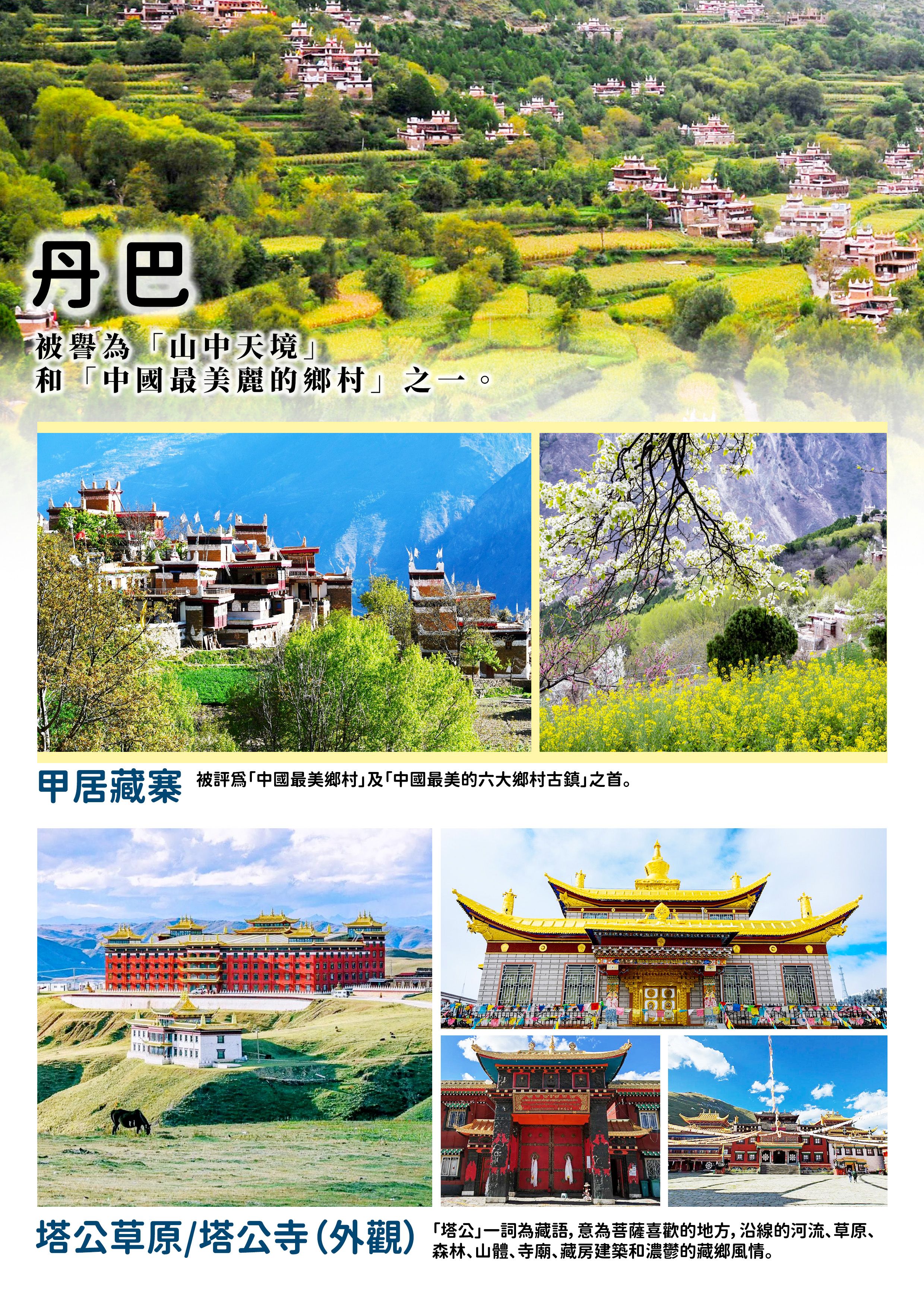 【甲居藏寨】川西的藏式建築,獨特的藏式樓房建築,一戶人家住一幢寨樓,與世隔絕的絕美村落,被評爲「中國最美鄉村」及「中國最美的六大鄉村古鎮」之首。「甲居」在藏語是百戶人家的意思,在高差近千米的山坡上,一幢幢藏式樓房灑落在綠樹叢中,星羅棋布,襯以裊裊的炊煙,潔白的牆壁上繪有日月星辰及宗教圖案,美麗而壯觀。【塔公草原】「塔公」一詞為藏語,意為菩薩喜歡的地方,沿線的河流、草原、森林、山體、寺廟、藏房建築和...