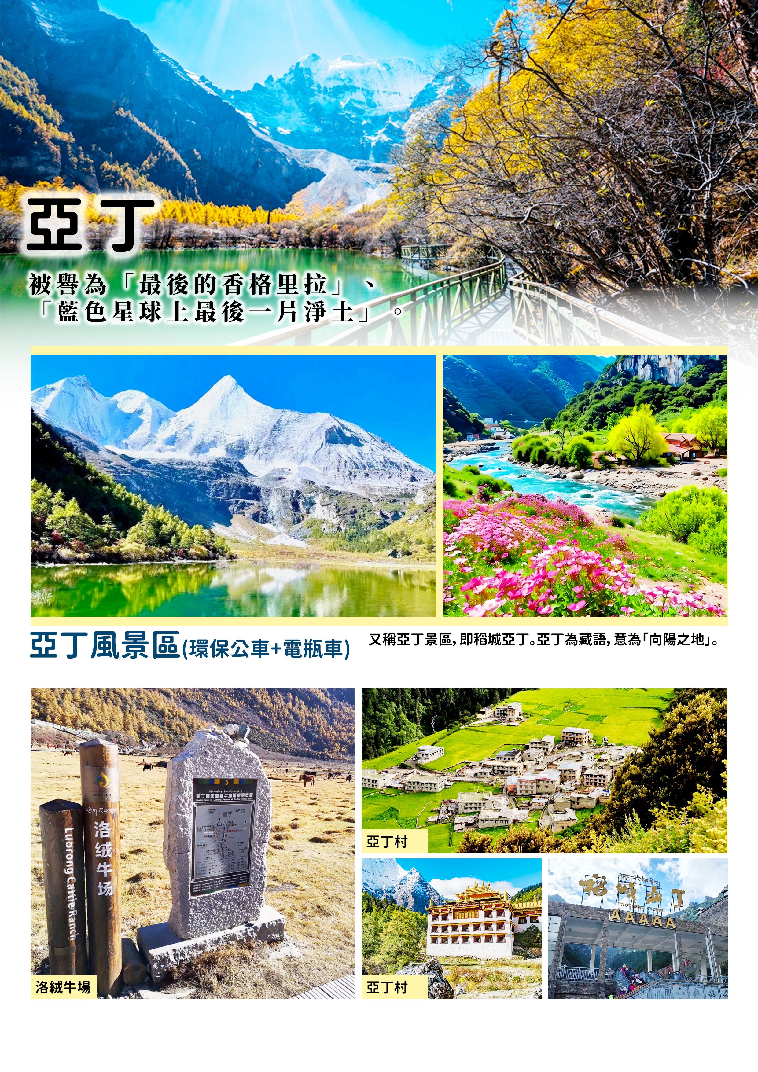 【亞丁風景區(環保公車+電瓶車)】又稱亞丁景區,即稻城亞丁。亞丁為藏語,意為「向陽之地」,位於甘孜州稻城縣南部,主要由仙乃日(意海拔6032米)、央邁勇(海拔5958米)、夏諾多吉(海拔5958米),三座神山和周圍的河流、湖泊和高山草甸組成,這裡保持著在地球上近絕跡的純粹,因其獨特的地貌和原生態的自然風光,被譽為「最後的香格里拉」、「藍色星球上最後一片淨土」。景區內不僅有壯麗神聖的雪山,還有遼闊的...