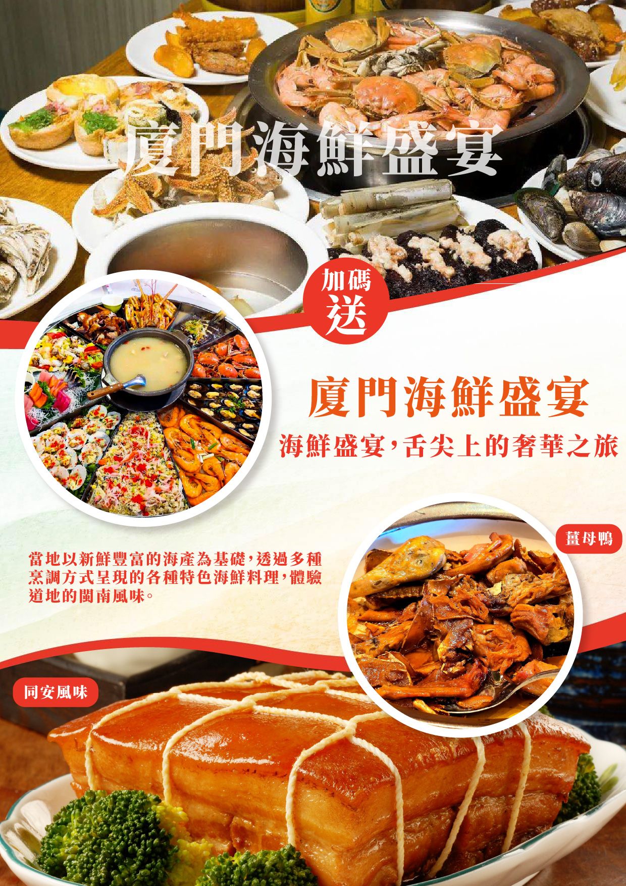 今天帶著輕鬆愉快的心情,集合於松山機場/清泉崗機場/小港機場,搭乘豪華客機飛往【金門】。搭乘豪華遊輪前往【廈門】。【閩南水鄉】閩南水鄉通過對九十九灣進行治水、清淤、造景,塑造濱水休閑遊憩空間,實現「河暢、水清、岸綠、景美、業興」目標,整合了水利、生態和休閑三大功能,突出自然生態特色,塑造濱水休閑遊憩空間,為市民創造易於近水、親水的舒適環境。【九十九灣】是漳州最廣最長的內河。沒人知道這名字的由來,更...